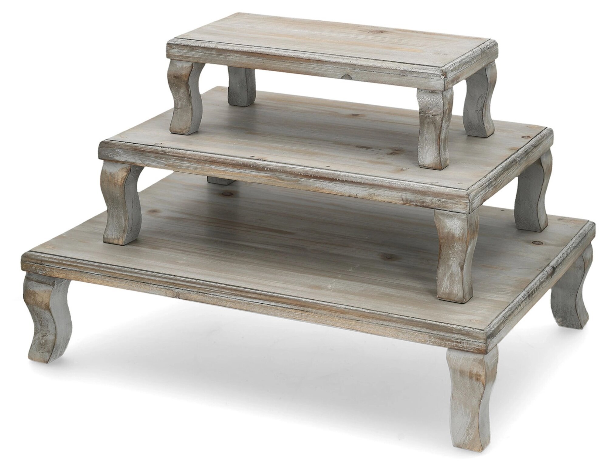 De rustika ytorna i grånat trä ger en charmig, vintagekänsla som passar i många olika inredningsstilar – från lantligt till modernt. Podierna kan användas både tillsammans i en harmonisk grupp eller var för sig.
