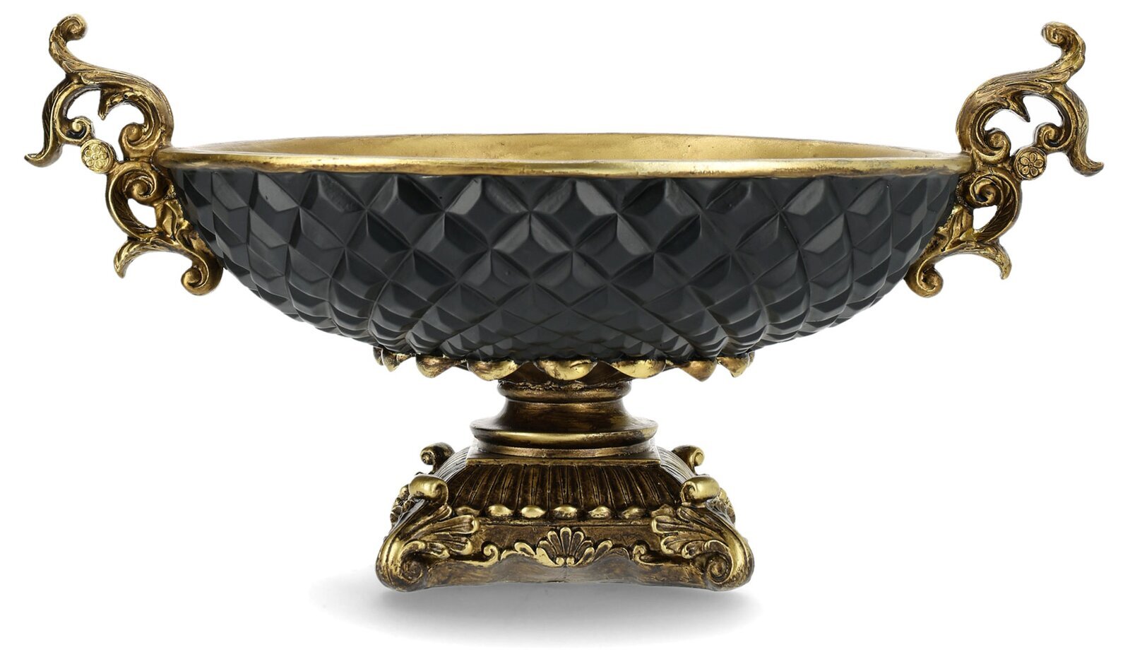 En dekorationsskål som fångar blicken med sin mörka, diamantmönstrade yta och vackert utsirade gulddetaljer. Den skulpturala foten och de sirligt formade handtagen ger skålen ett antikt uttryck – perfekt som mittpunkt i ett stilleben eller som elegant dekoration på ett sideboard eller soffbord. Skålen är lika vacker tom som fylld, och tillför en känsla av dramatik och tidlös elegans i hemmet.