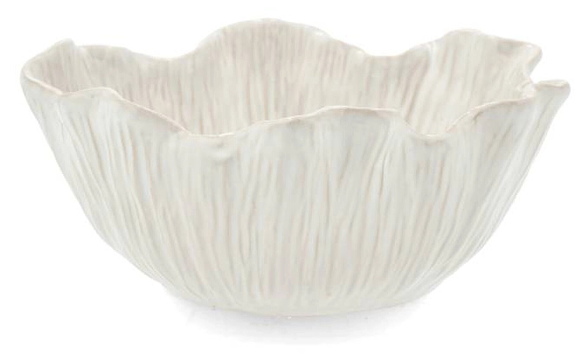 En elegant skål i keramik med mjukt böljande kant och vacker, strukturerad yta som påminner om blomblad. Den ljusa tonen ger ett harmoniskt och stilrent uttryck som passar i både klassiska och moderna miljöer.