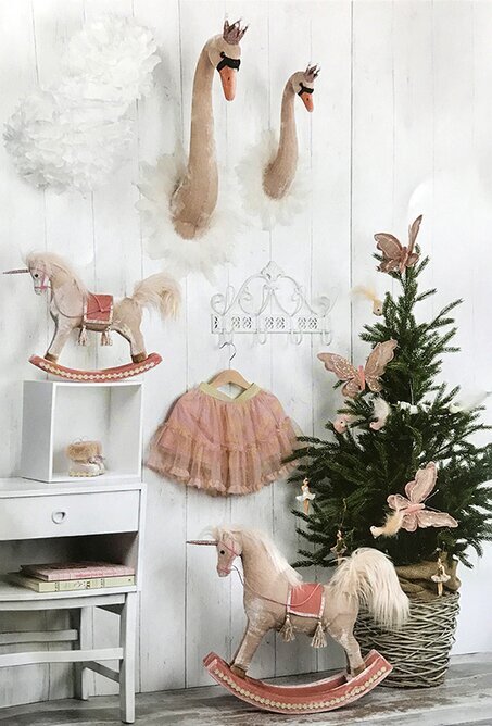 Centralt i bilden står en gunghäst formad som en enhörning i liknande creme och rosa toner, med detaljer som rosettprydda tränsar och en sadel. Enhörningen, liksom svanarna, är också en produkt av varumärket A Lot Decoration och erbjuder ett tema av magisk lek.