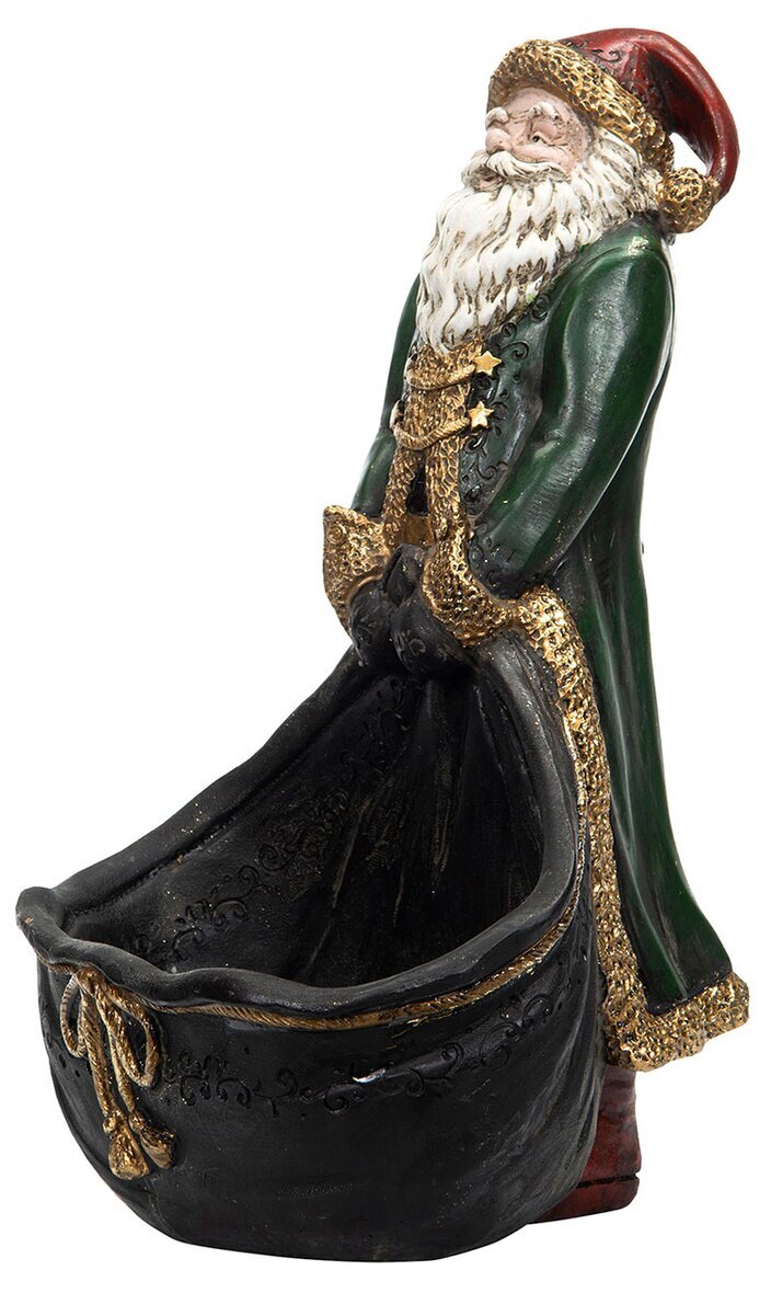 Bilden visar en detaljerad figur från Köpstaden.se med namnet "Tomte Julklappssäck" från varumärket A Lot Decoration. Den föreställer en klassisk tomte, stående ståtligt med en stor, öppen säck framför sig. Figurerad i robust material, tomten bär en djupt grön rock med fint detaljerade guldkanter som löper längs fållarna och manschetterna. Dessa detaljer ger en fin kontrast mot det mörkare tyget.