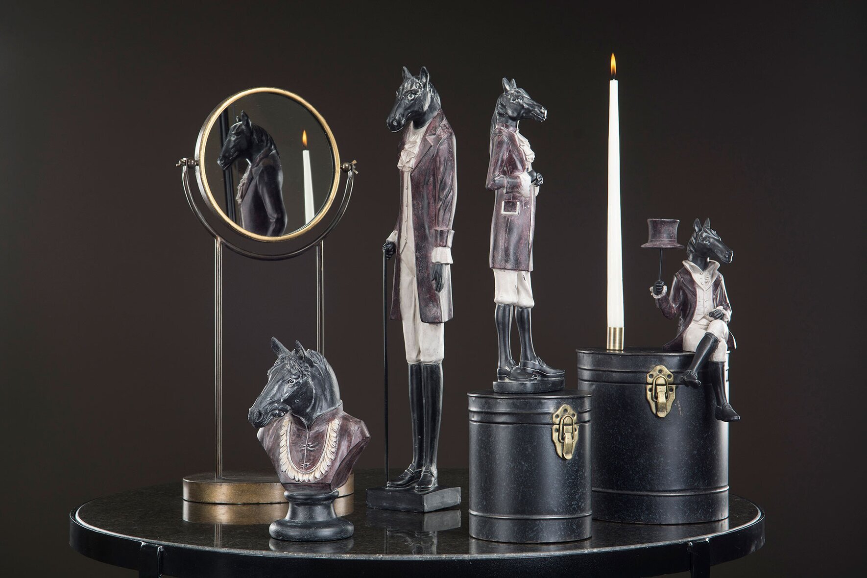 Bordet ovanpå vilket dessa konstverk är placerade är mörkt och polerat, vilket skapar en kontrasterande bakgrund som låter detaljerna i statyerna stå ut. Längst bak finns en rund spegel med guldram som reflekterar ljuset och en av hästfigurerna, vilket förstärker djupet i bilden. Intill spegeln står ett elegant ljus, där lågan ger en mild och varm belysning över de andra objekten.
