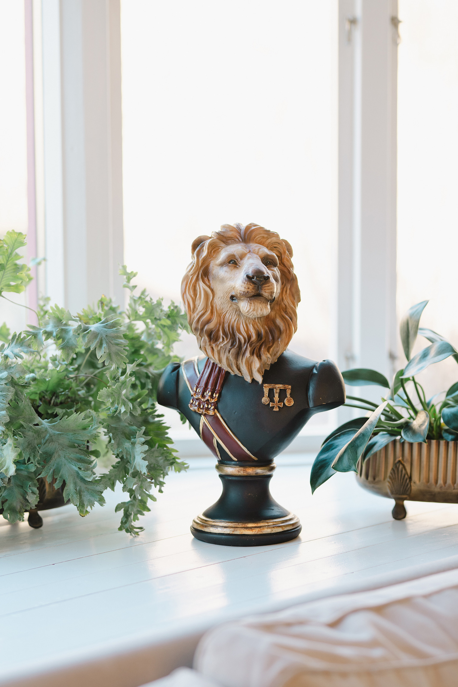 En ståtlig och dekorativ byst föreställande ett lejon i uniform, komplett med medaljer och detaljerade inslag i guld och vinrött. Denna figur kombinerar styrka och elegans, och blir en riktig blickfångare i hemmet.