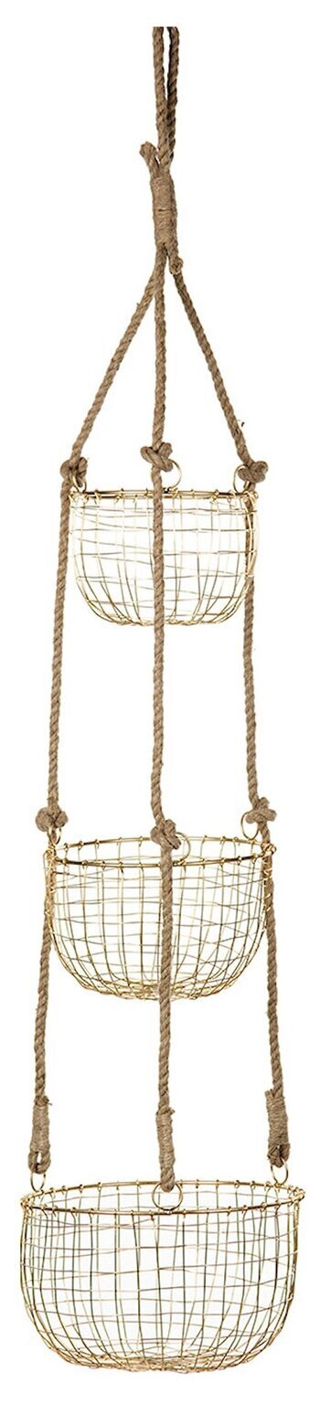 Hängande korg i 3 nivåer är en praktisk och dekorativ lösning för förvaring och organisering i hemmet. Tillverkad av slitstarkt metallnät med repdetaljer i naturmaterial, kombinerar den funktion och stil.