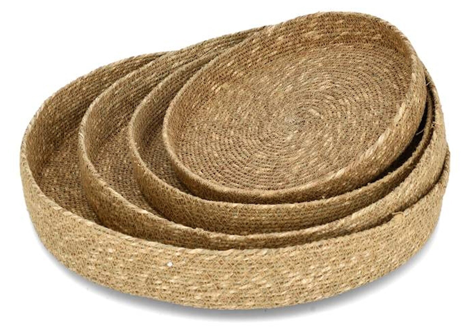 Ett dekorativt set med fyra brickor i naturmaterial. De flätade brickorna har en varm och naturlig ton som ger en mjuk och inbjudande känsla i hemmet.