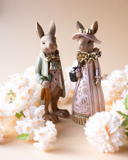 Ett charmigt dekorationspar som skapar en varm och lekfull påskkänsla i hemmet. Herr och fru kanin är klädda i mjuka pastelltoner med vackra detaljer som ger dem ett tidlöst och elegant uttryck.