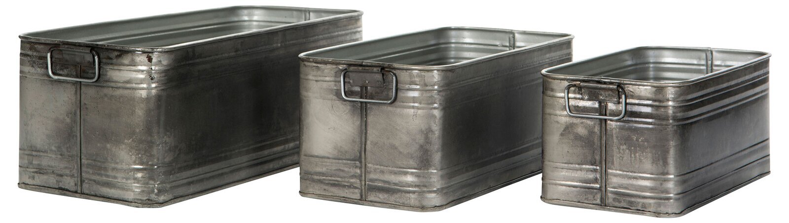 Alla tre krukorna har robusta handtag på varje kortsida, vilket underlättar förflyttning av dessa tunga föremål. Handtagen är praktiska och smälter in i den övergripande designen, vilket gör dem integrerade i krukornas funktionalitet.
