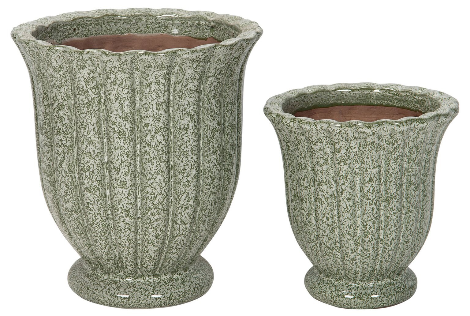 De två krukorna skiljer sig åt i storlek, där den ena är högre och mer voluminös medan den andra är något lägre och mindre vid. Den gröna färgen täcker hela utsidan, men insidan av öppningen har en mer naturligt brunglaserad ton, vilket tydligt syns tack vare ljussättningen på bilden. Ovankanten på varje blomkruka är vågformad, vilket ger en mjuk, lekfull siluett som kontrasterar mot de annars raka linjerna på sidorna.