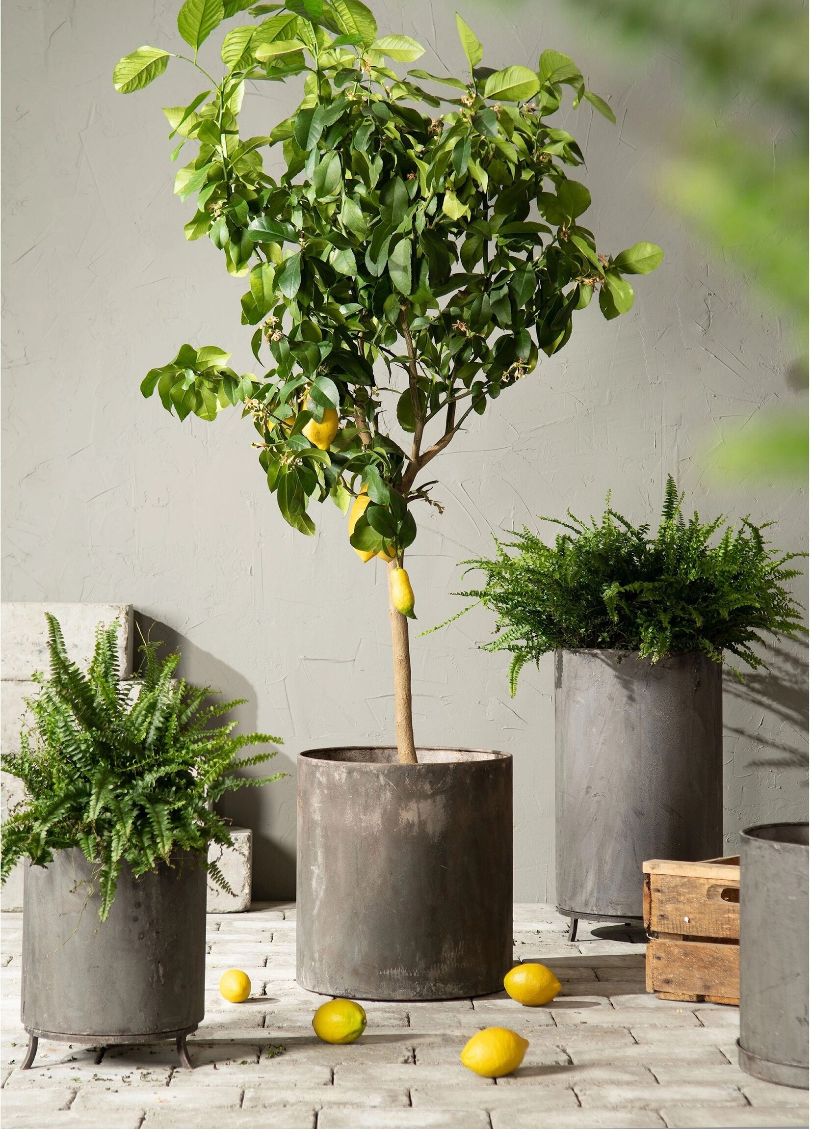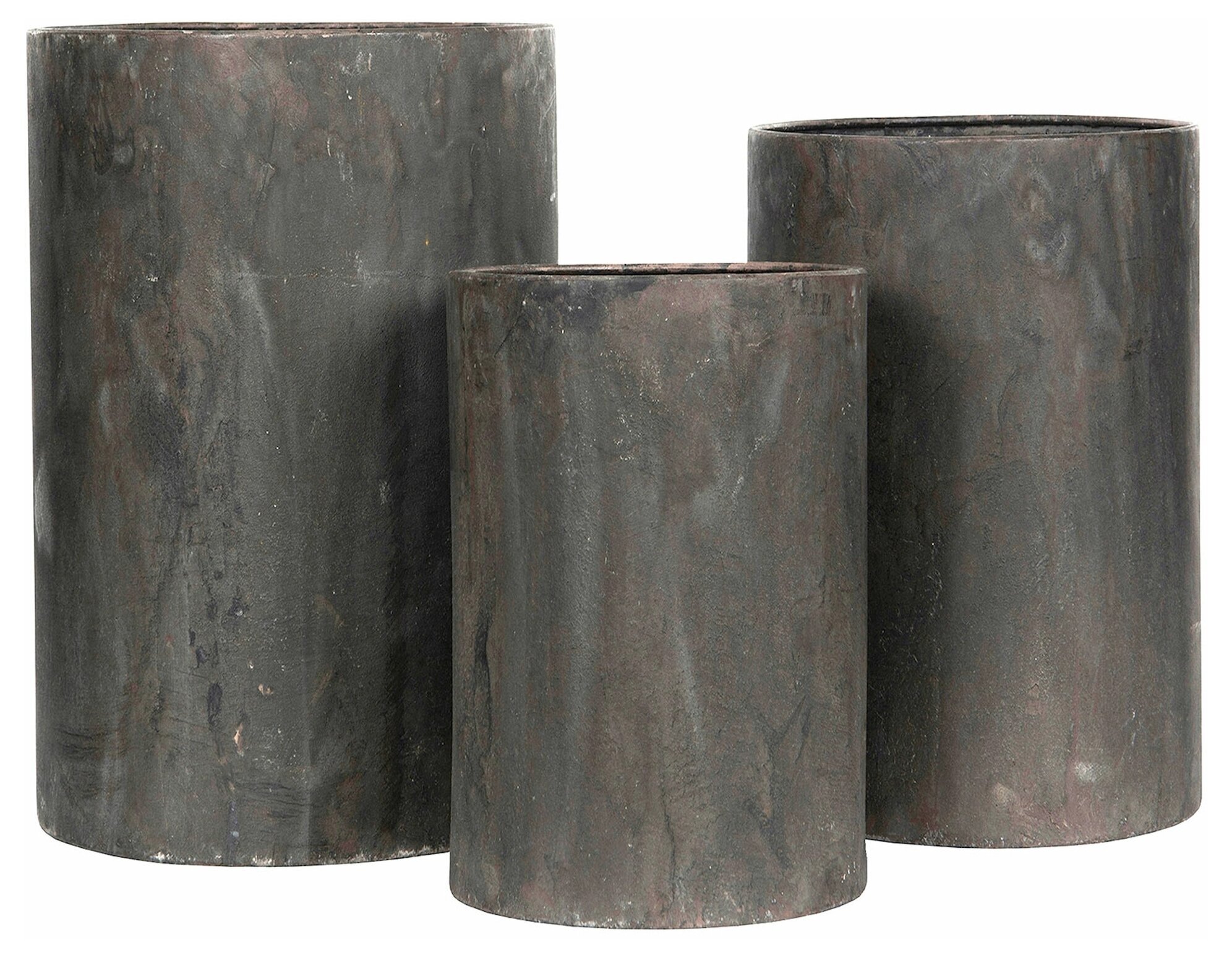 Stilrena krukor i metall med en vacker, lätt sliten yta som ger dem ett charmigt och nästan antikt uttryck. Den runda formen gör dem enkla att placera både inomhus och utomhus, där de passar lika bra till gröna växter som till små träd eller säsongens blommor.
