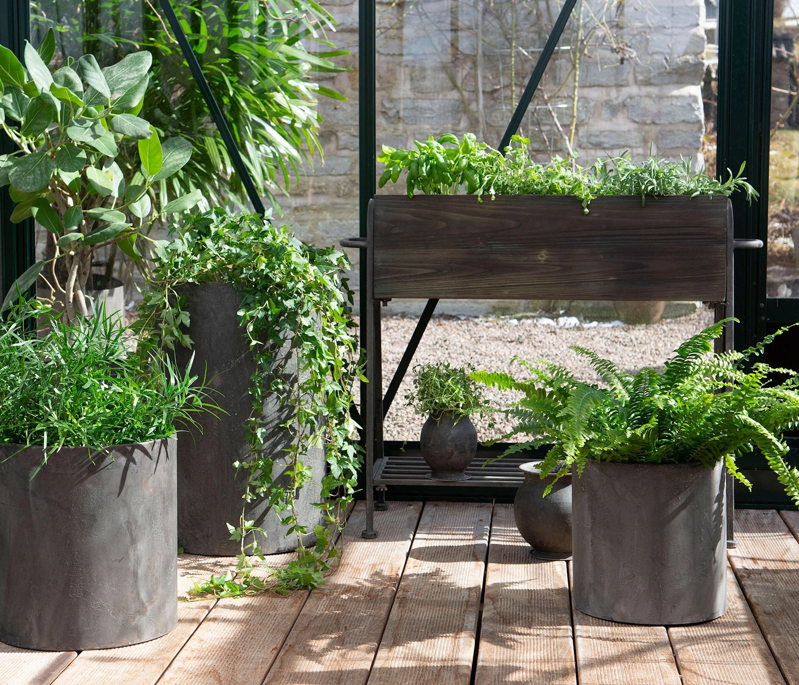 Den mörka metallytan ger en fin kontrast till det gröna och skapar en lugn och naturlig känsla i både trädgård, växthus, på altanen eller i hemmet. Varje kruka har en unik patina som ger liv och karaktär.