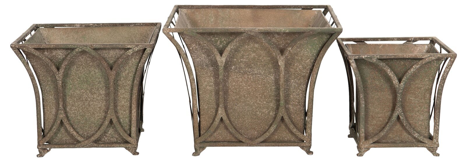 Dessa vackra metallkrukor förenar klassisk design med en rustik patina för en tidlös känsla. De dekorativa detaljerna skapar en elegant inramning för dina favoritväxter, oavsett om de står på verandan, i trädgården eller inomhus.
