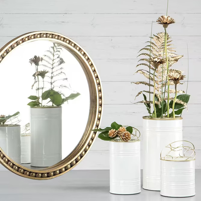 I bilden ser vi också spegelns roll som en harmonisk del av kompositionen. En rund spegel med en guldfärgad ram är placerad bakom vasen. Ramens detaljrikedom med små cirkulära prydnader ger en extra dimension och äldre charm till helhetsbilden, och den reflekterar inte bara de omgivande objekten utan också ljuset, vilket bidrar till en ljus och öppen atmosfär.
