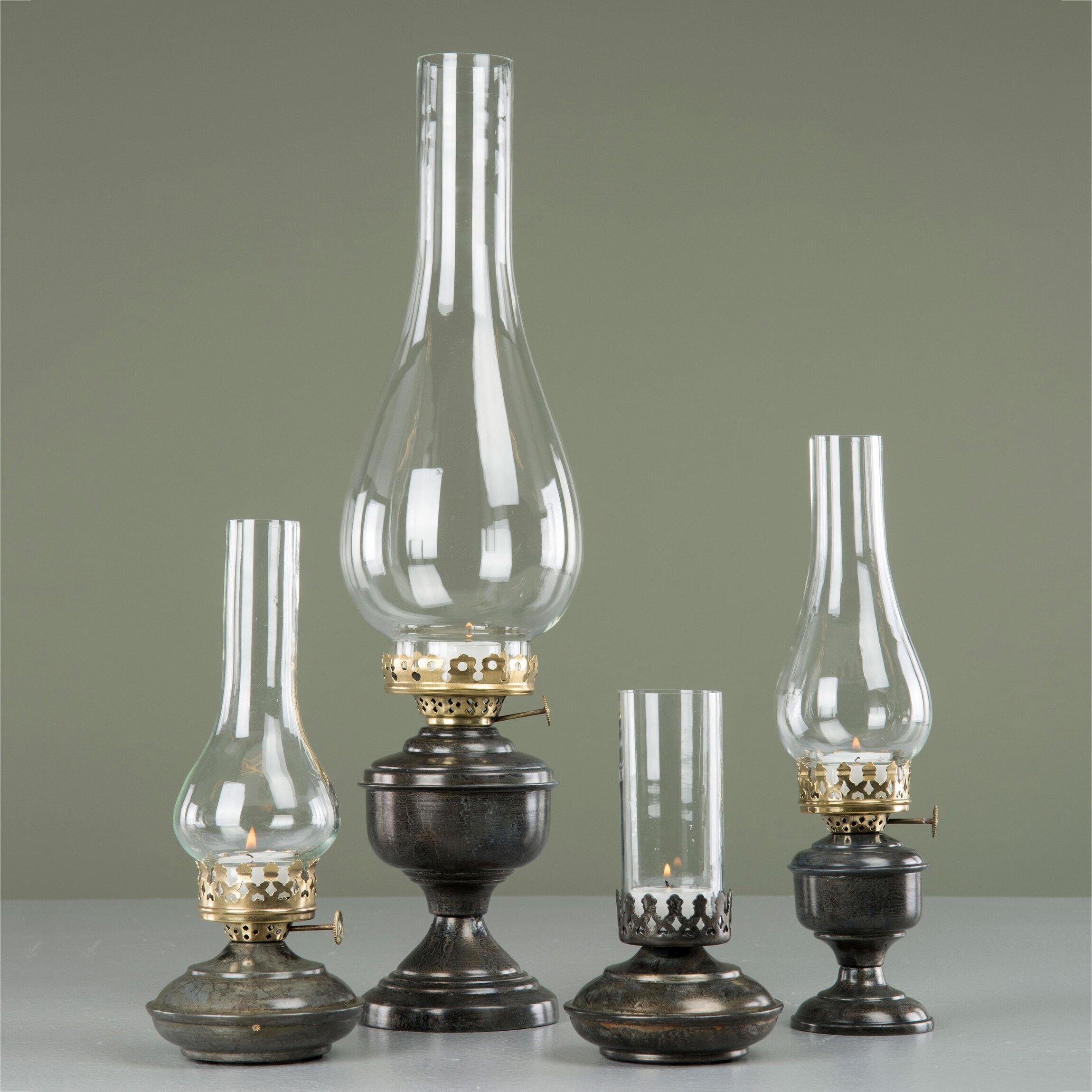 Varje lampa har en unik storlek och form, men alla delar en liknande designestetik. De är tillverkade av mörkt metallmaterial för baserna, vilket ger dem ett robust och hållbart utseende. Den mörka metallen kontrasterar snyggt mot de klara glasbehållarna som sitter ovanpå.