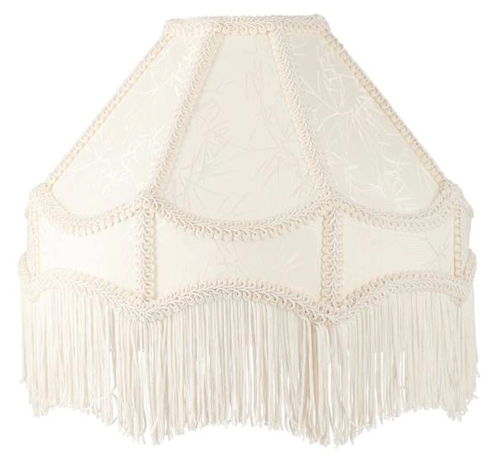 Ge ditt hem en dos dramatik och vintagekänsla med denna dekorativa lampskärm i en vacker ljus nyans med fransar. De vackra textilpartierna, detaljerade kantbanden och den svängda formen ger ett elegant uttryck som drar blickarna till sig – oavsett om den används som traditionell skärm eller som fristående taklampa med upphängning.