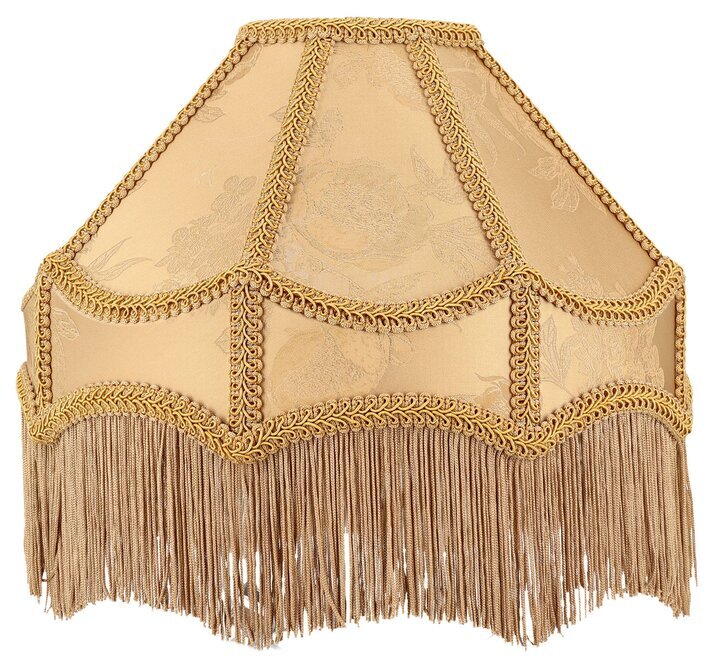 Ge ditt hem en dos dramatik och vintagekänsla med denna dekorativa lampskärm i en vacker guldfärg med fransar. De vackra textilpartierna, detaljerade kantbanden och den svängda formen ger ett elegant uttryck som drar blickarna till sig – oavsett om den används som traditionell skärm eller som fristående taklampa med upphängning.