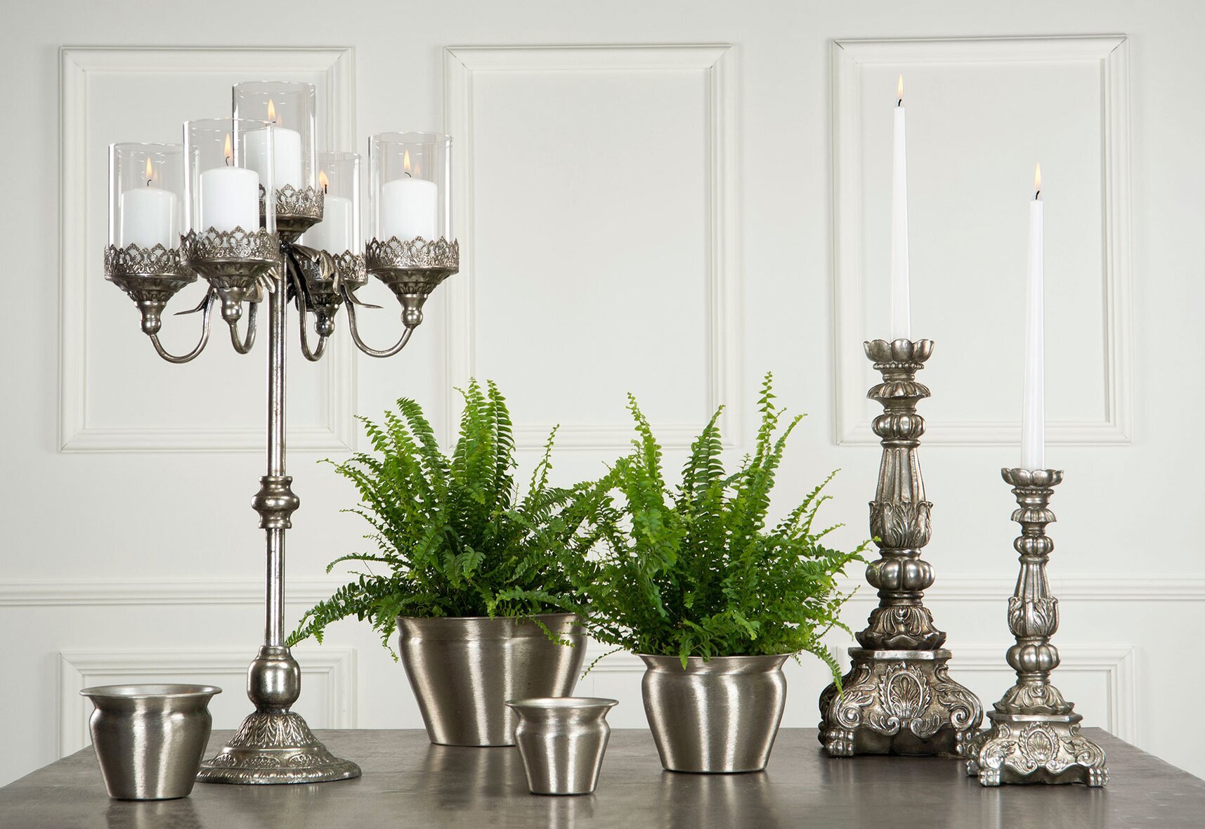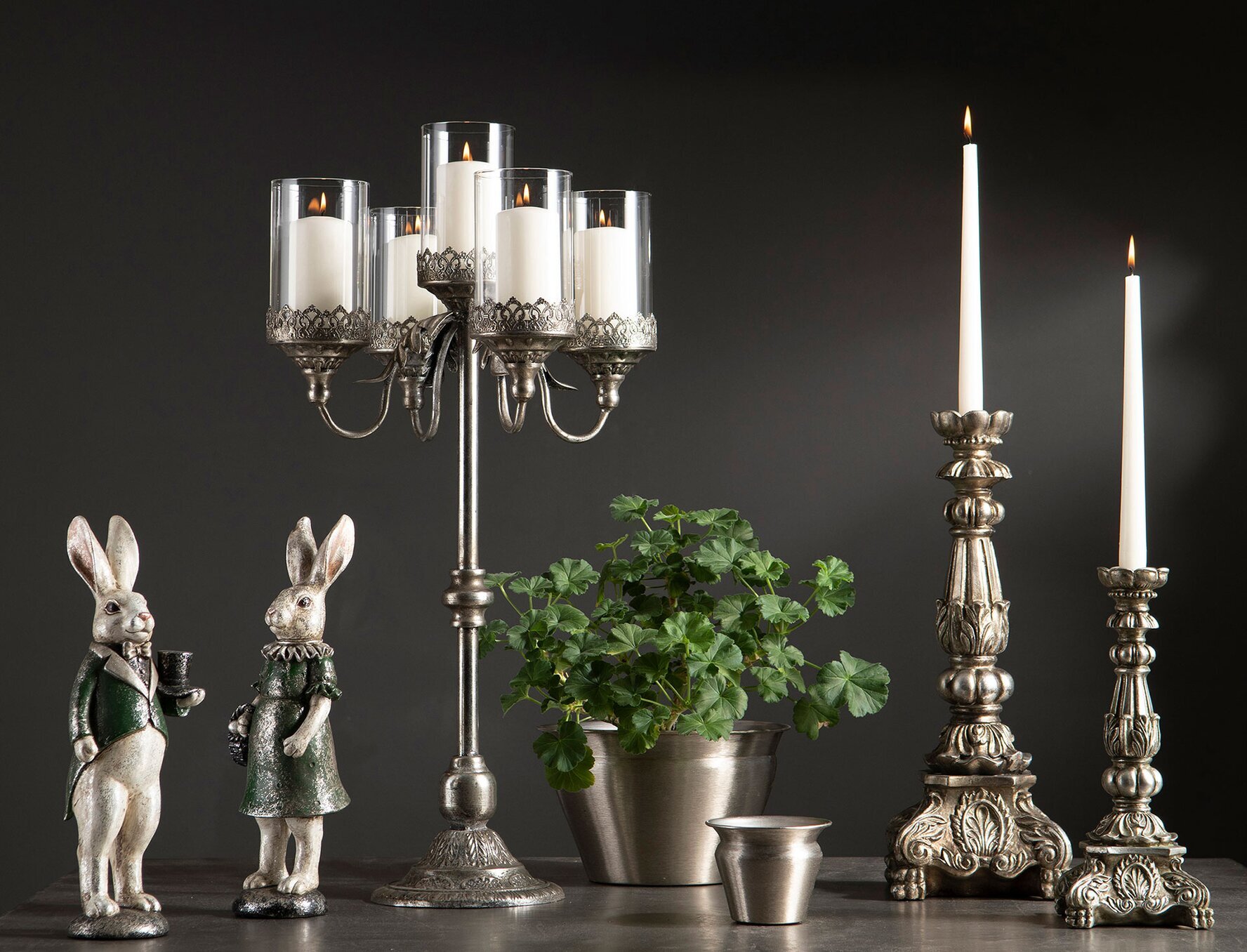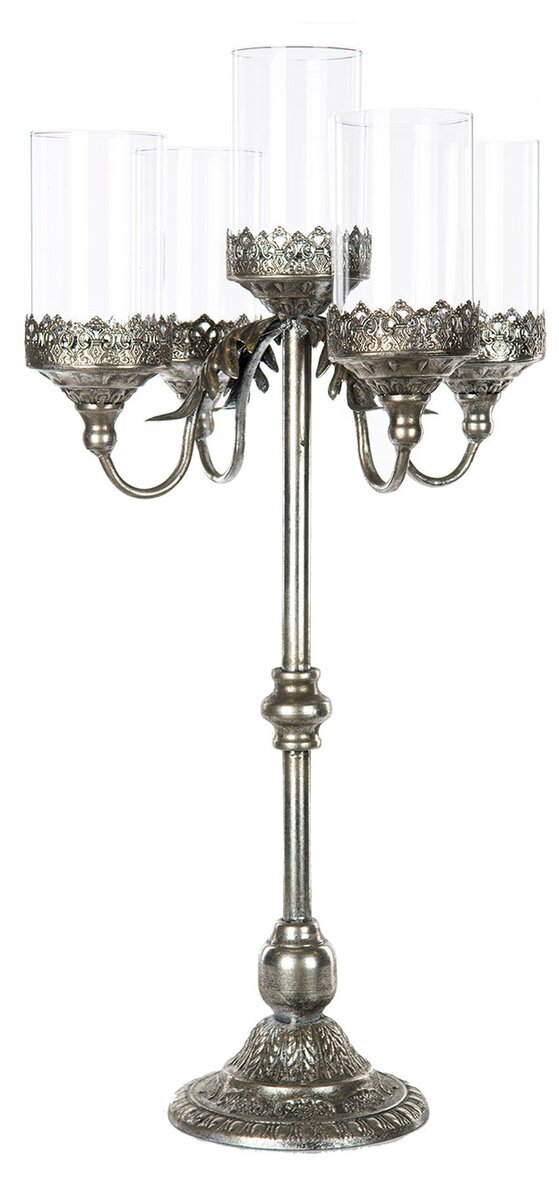 En vacker kandelaber i silverfinish som för tankarna till svunna tider. De fem ljushållarna med dekorativa glascylindrar skapar en ståtlig och stämningsfull belysning – perfekt för festdukningen, fönsterbänken eller som centerpiece i vardagsrummet. Den antikinspirerade designen med utsirade detaljer gör kandelabern till ett tidlöst blickfång i alla hem.