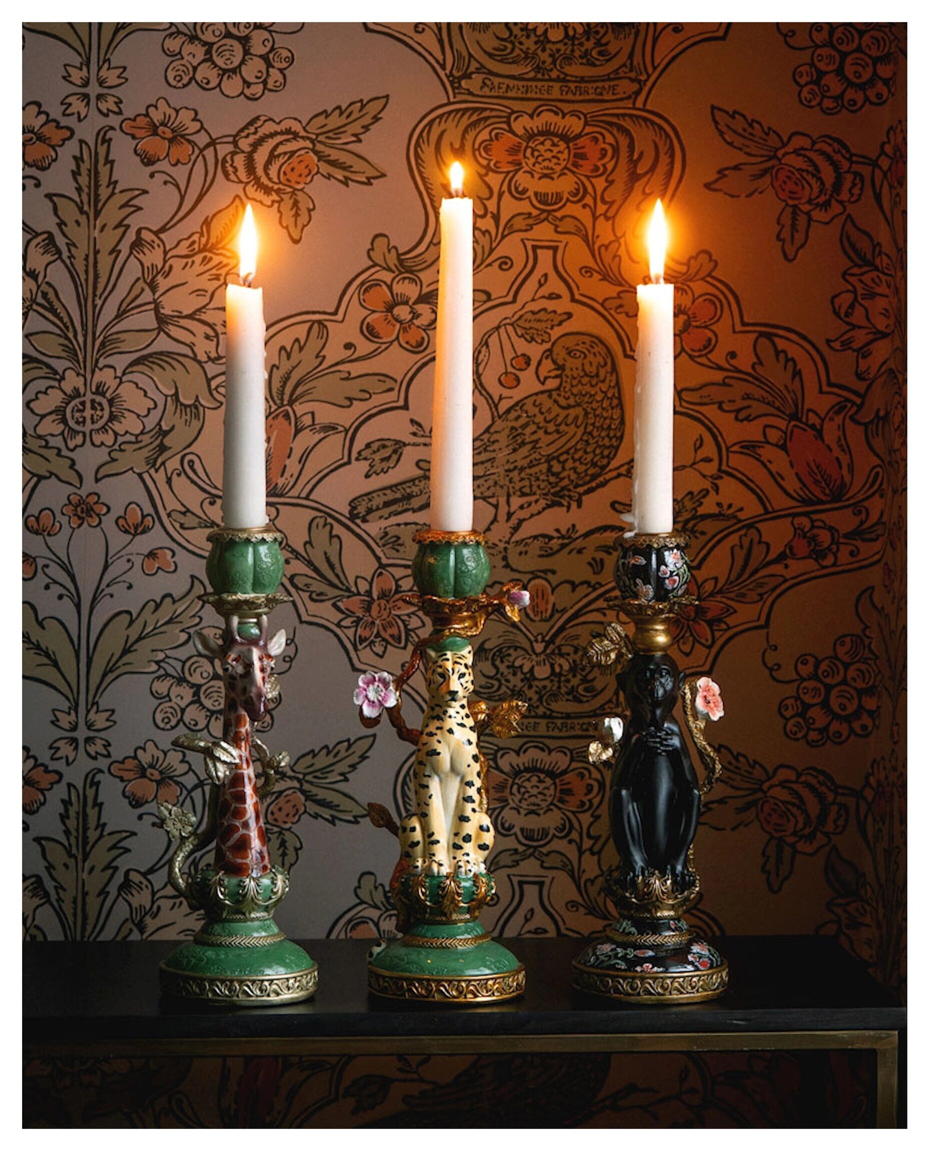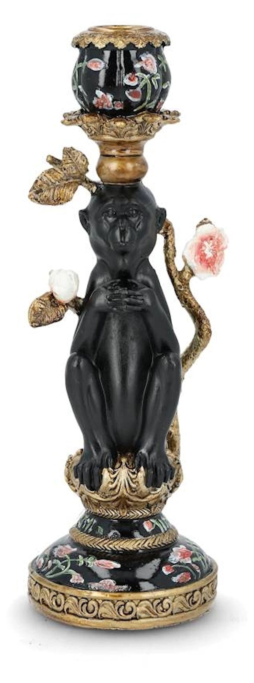 En lekfull och elegant ljusstake som garanterat väcker uppmärksamhet. Den sittande apan i svart finish kombineras med vackra gulddetaljer och ett dekorativt mönster med blommor, vilket ger ett exklusivt och lite teatraliskt uttryck.