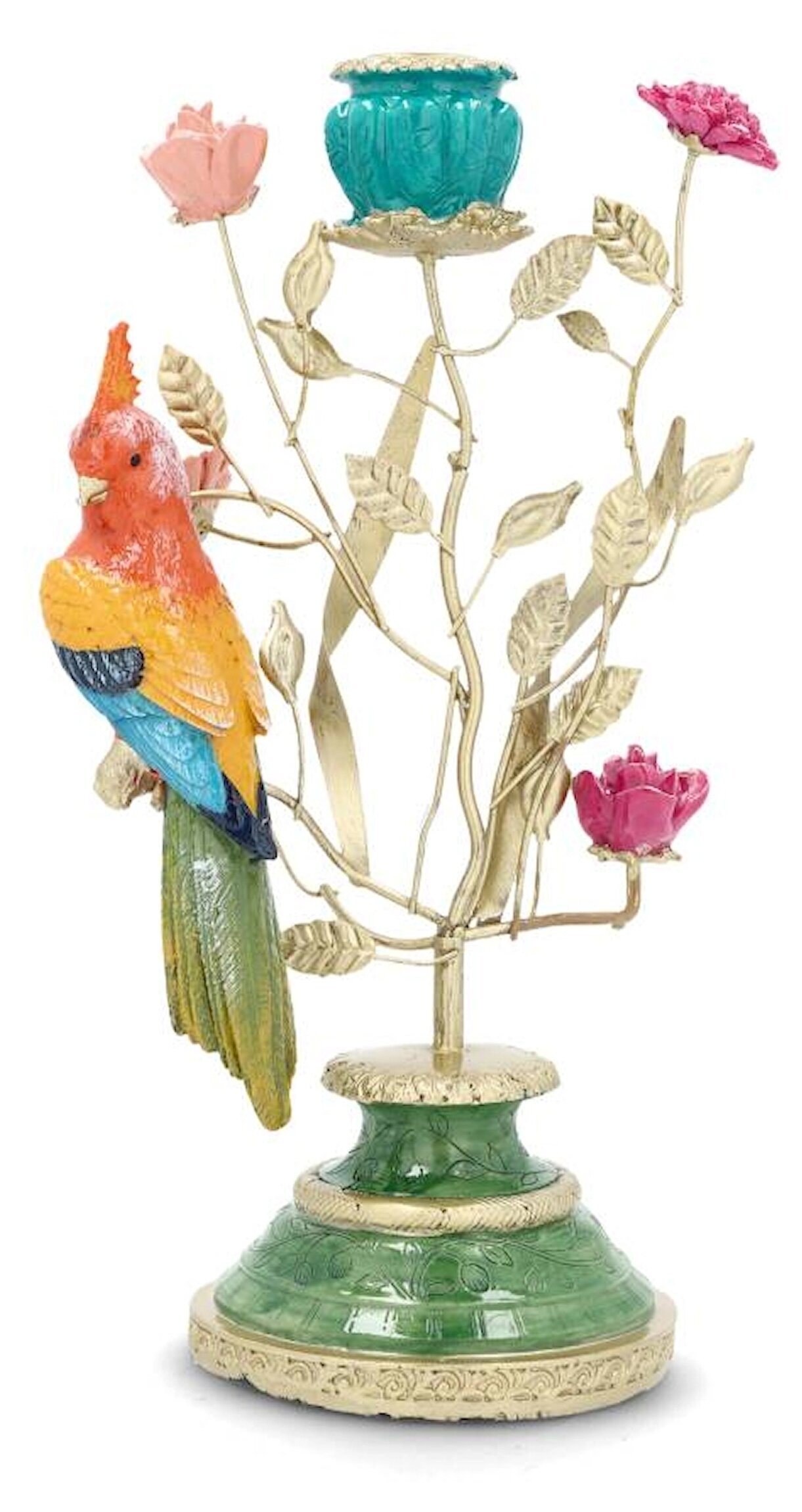 En färgsprakande ljusstake som verkligen drar blickarna till sig. Den dekorativa papegojan tillsammans med de fina guldfärgade grenarna och blommorna skapar ett lekfullt men samtidigt elegant uttryck.