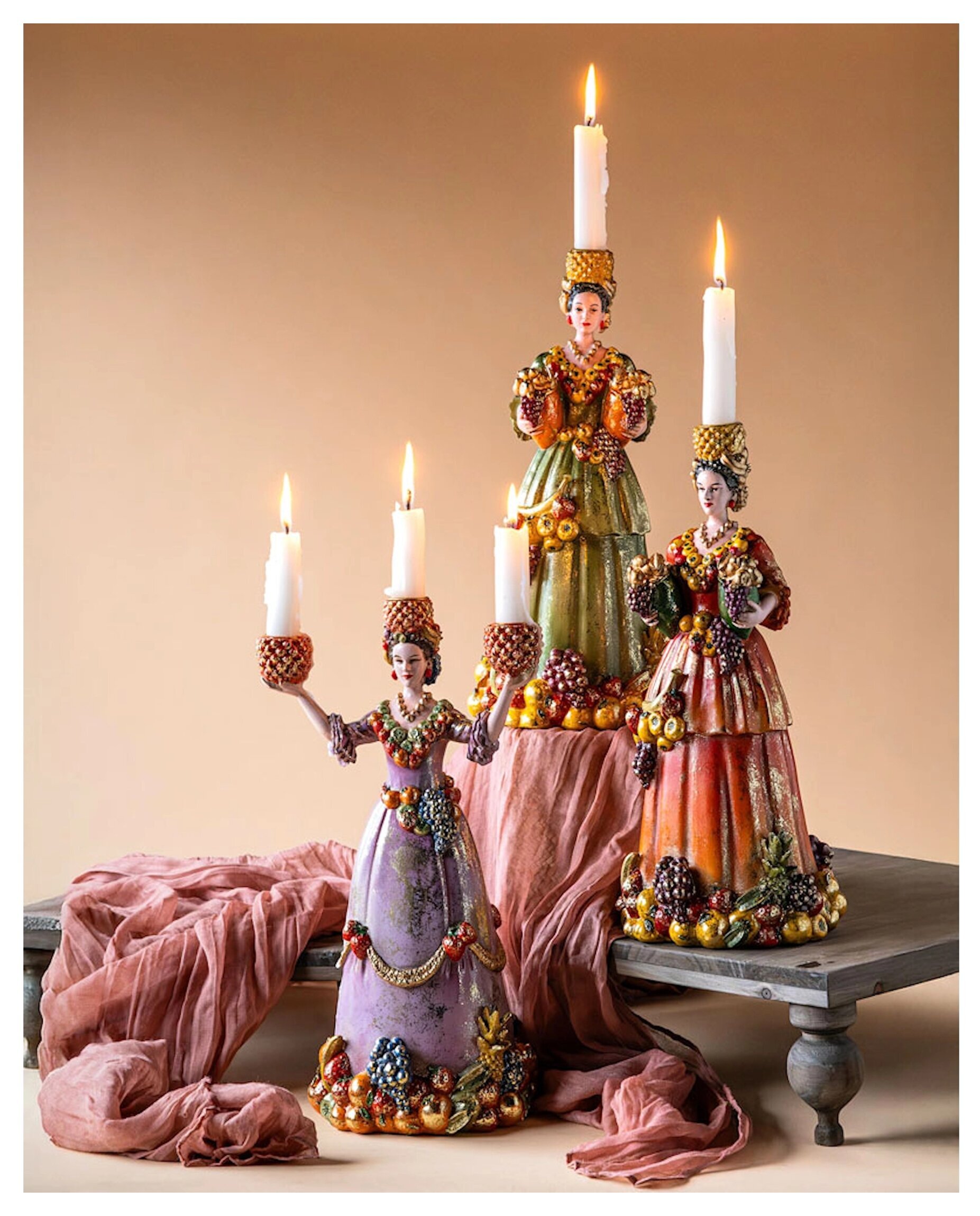 En färgstark och dekorativ ljusstake formad som en elegant kvinna klädd i en grön klänning, rikt utsmyckad med frukter i varma, levande toner. De vackra detaljerna och den glittrande finishen ger ett exklusivt och lekfullt uttryck som direkt drar blickarna till sig.