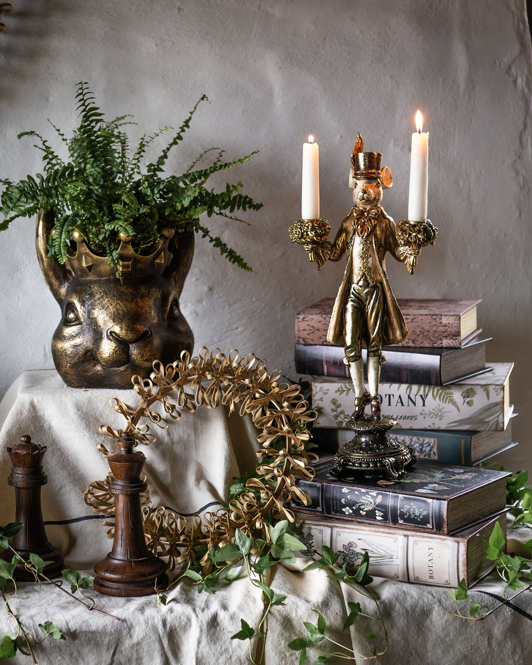 En förtrollande ljusstake i form av en mus klädd i hatt och frack, som håller två buketter i händerna där ljushållarna är placerade. Läs mer