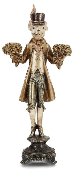 En förtrollande ljusstake i form av en mus klädd i hatt och frack, som håller två buketter i händerna där ljushållarna är placerade. En charmig och lekfull inredningsdetalj som sprider både ljus och glädje.