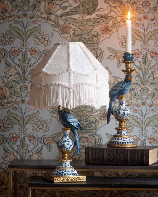 En elegant ljusstake med vacker papegoja som ger hemmet en charmig och exklusiv känsla. De handmålade detaljerna i blått och guld skapar ett lyxigt uttryck, och den klassiska formen gör den lika dekorativ med eller utan ljus. Placera den på ett sidobord, i fönstret eller som en del av en vacker dukning - den blir alltid ett blickfång.