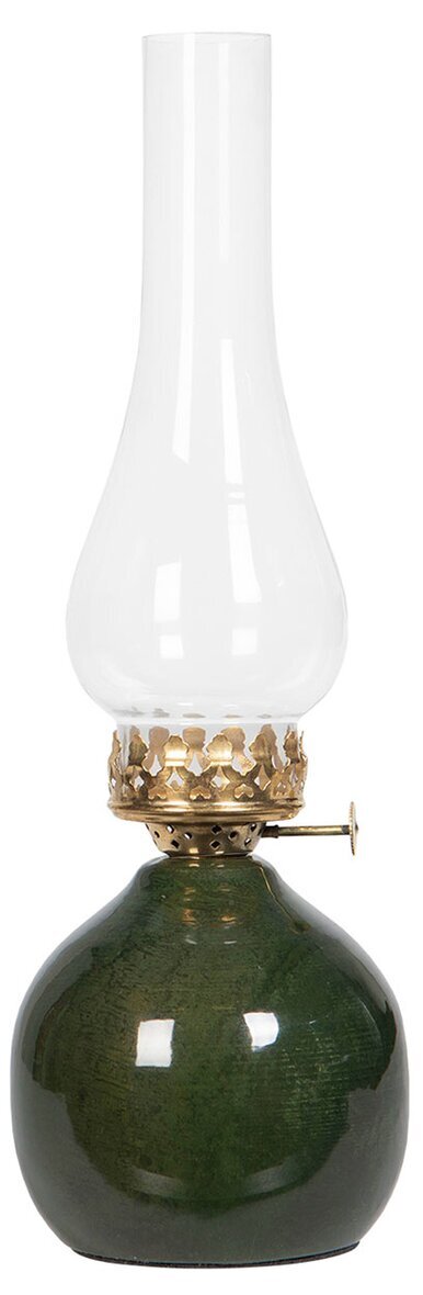 Skapa en varm och stämningsfull känsla i hemmet med denna eleganta oljelampa i klassisk design. Med sin glansiga mörkgröna fot, mässingsfärgade detaljer och höga glaskupa blir lampan både en praktisk ljuskälla och en vacker inredningsdetalj – perfekt för mysiga middagar, lugna kvällar eller som en charmig accent på fönsterbrädan.