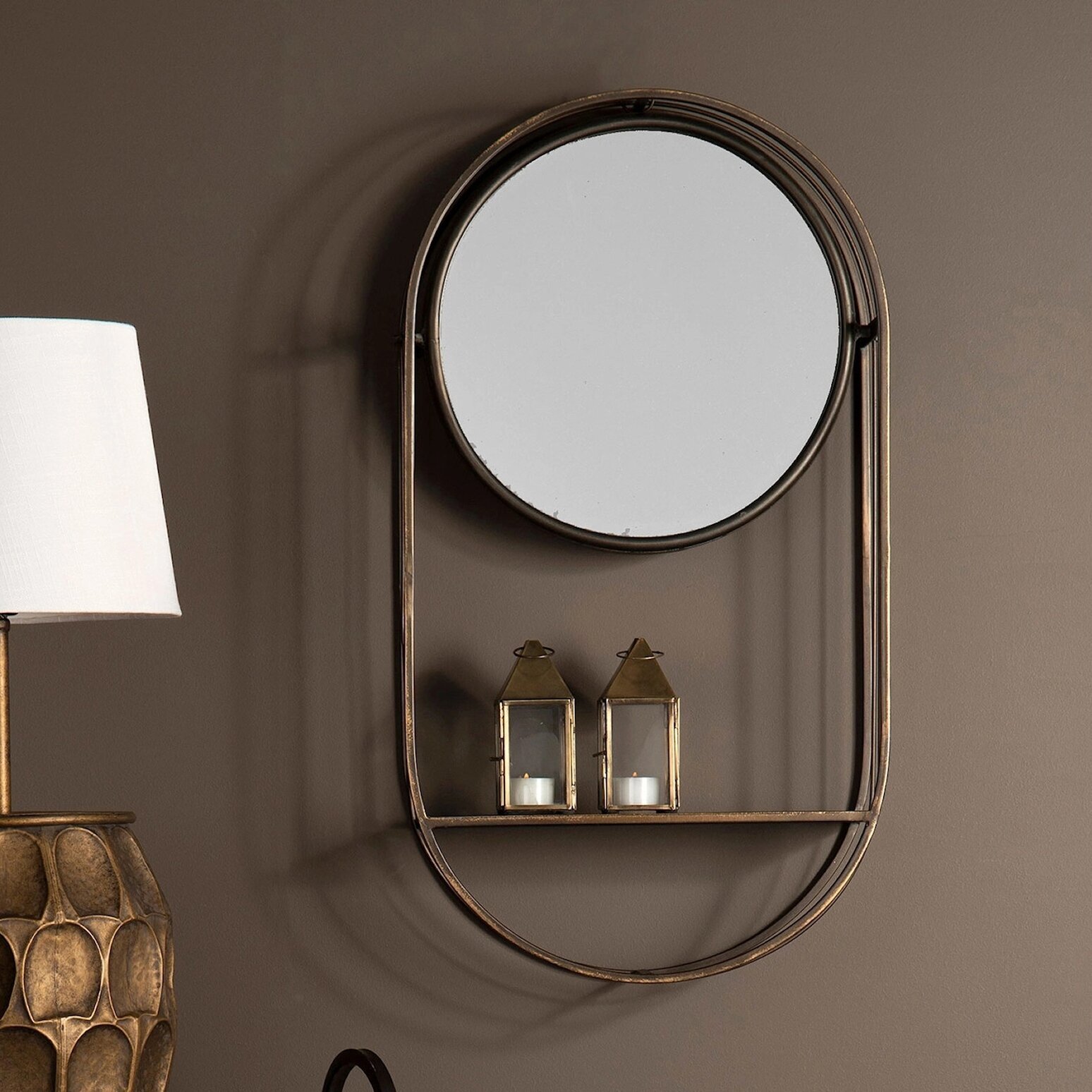 Stilren spegel med integrerad hylla som blir ett vackert blickfång på väggen. Den runda spegeln ramas in av en dekorativ metallstruktur och det praktiska hyllplanet är perfekt för ljuslyktor, små vaser eller en grön växt.