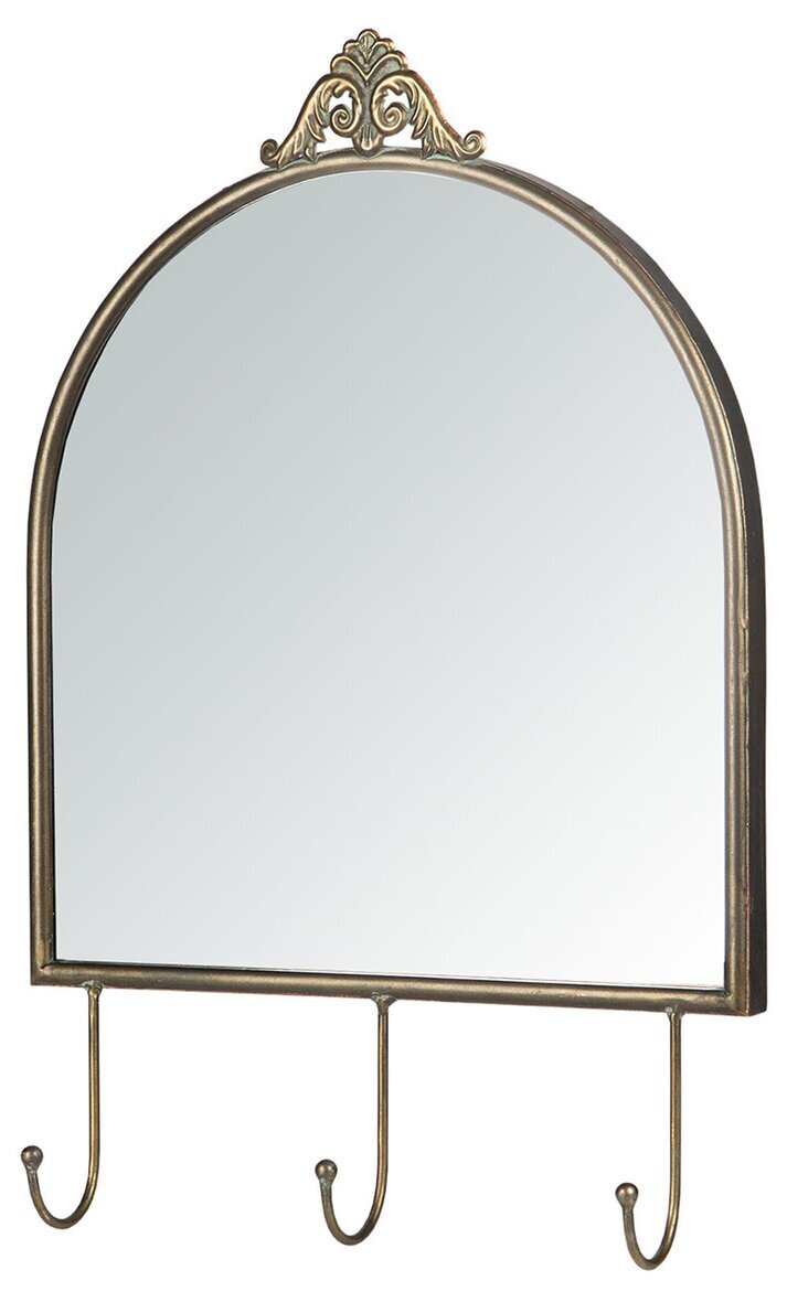 Den här eleganta vägghängda spegeln i antik mässingsfinish kombinerar klassisk design med praktisk funktion. De tre krokarna undertill gör den perfekt i hallen för nycklar, sjalar eller smycken – samtidigt som spegeln adderar både rymd och charm till rummet.
