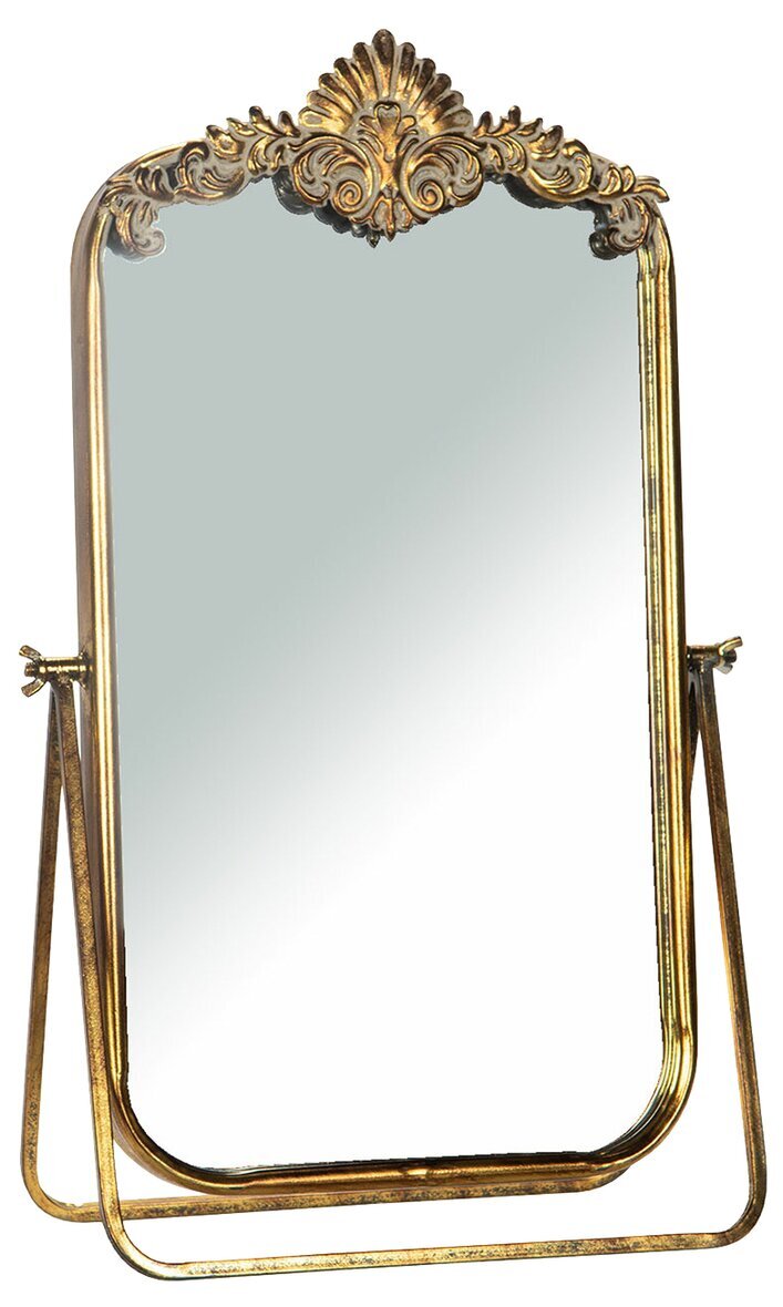 Vacker, justerbar spegel med dekorativt ornament upptill som ger hemmet en elegant, klassisk känsla. Den står stadigt på sin ställning och kan vinklas efter behov – perfekt i fönstret, på byrån eller på ett sideboard.