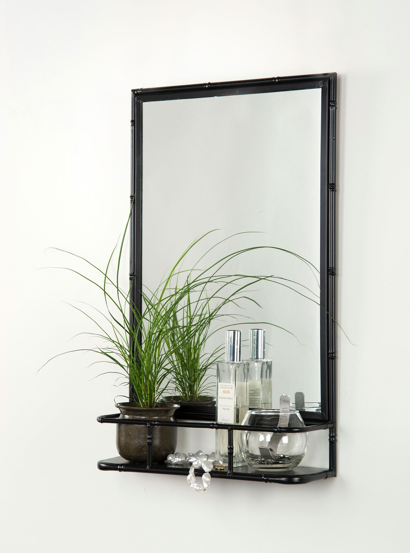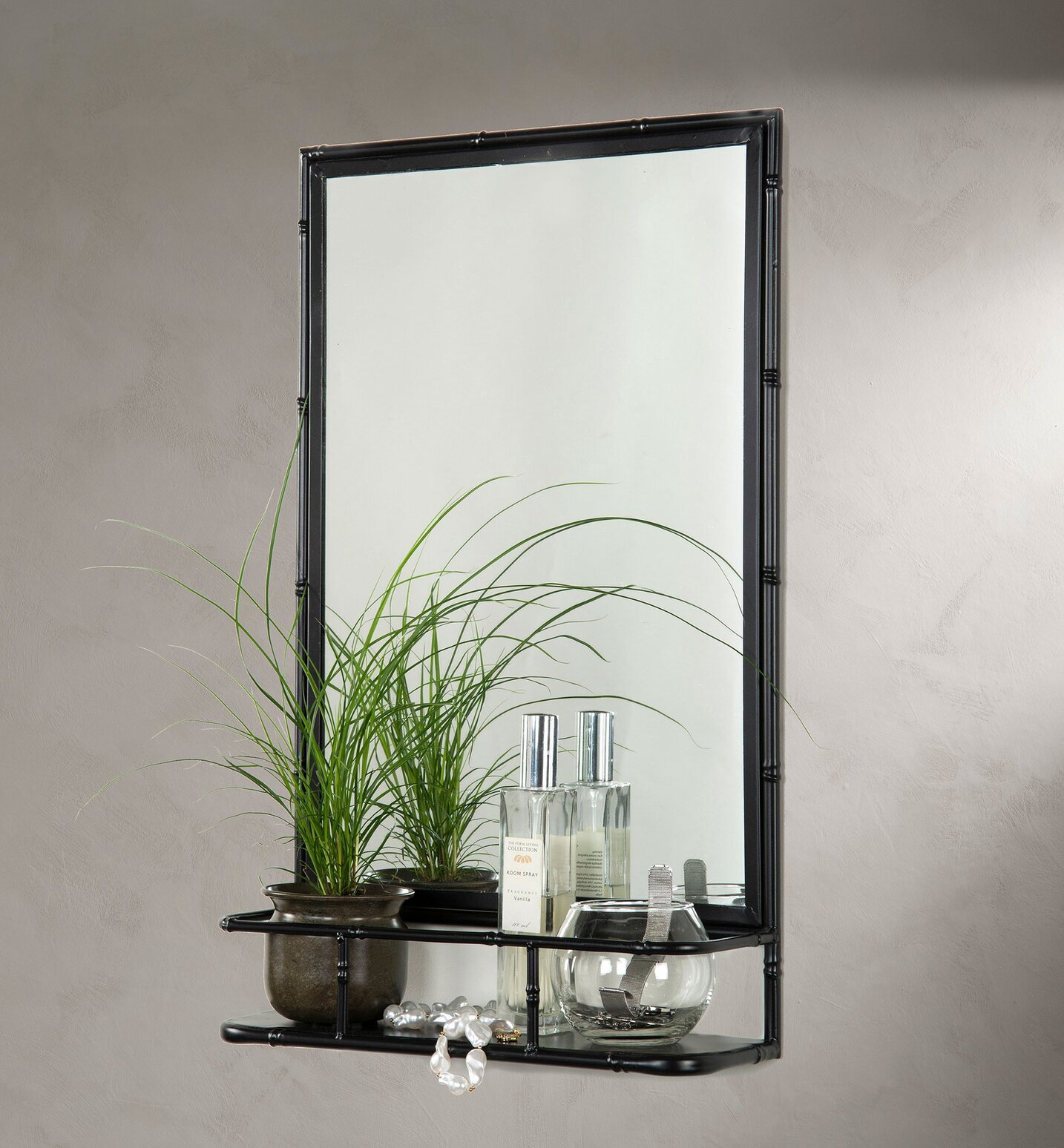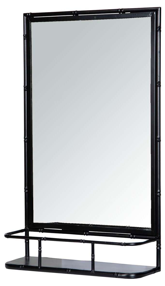En praktisk och dekorativ spegelhylla i svartlackerad metall med bambuinspirerade detaljer. Den stilrena designen gör sig lika bra i hallen som i badrummet eller sovrummet. Den integrerade hyllan ger plats för småsaker som parfymflaskor, växter eller smycken – perfekt för dig som vill kombinera funktion med smakfull inredning.