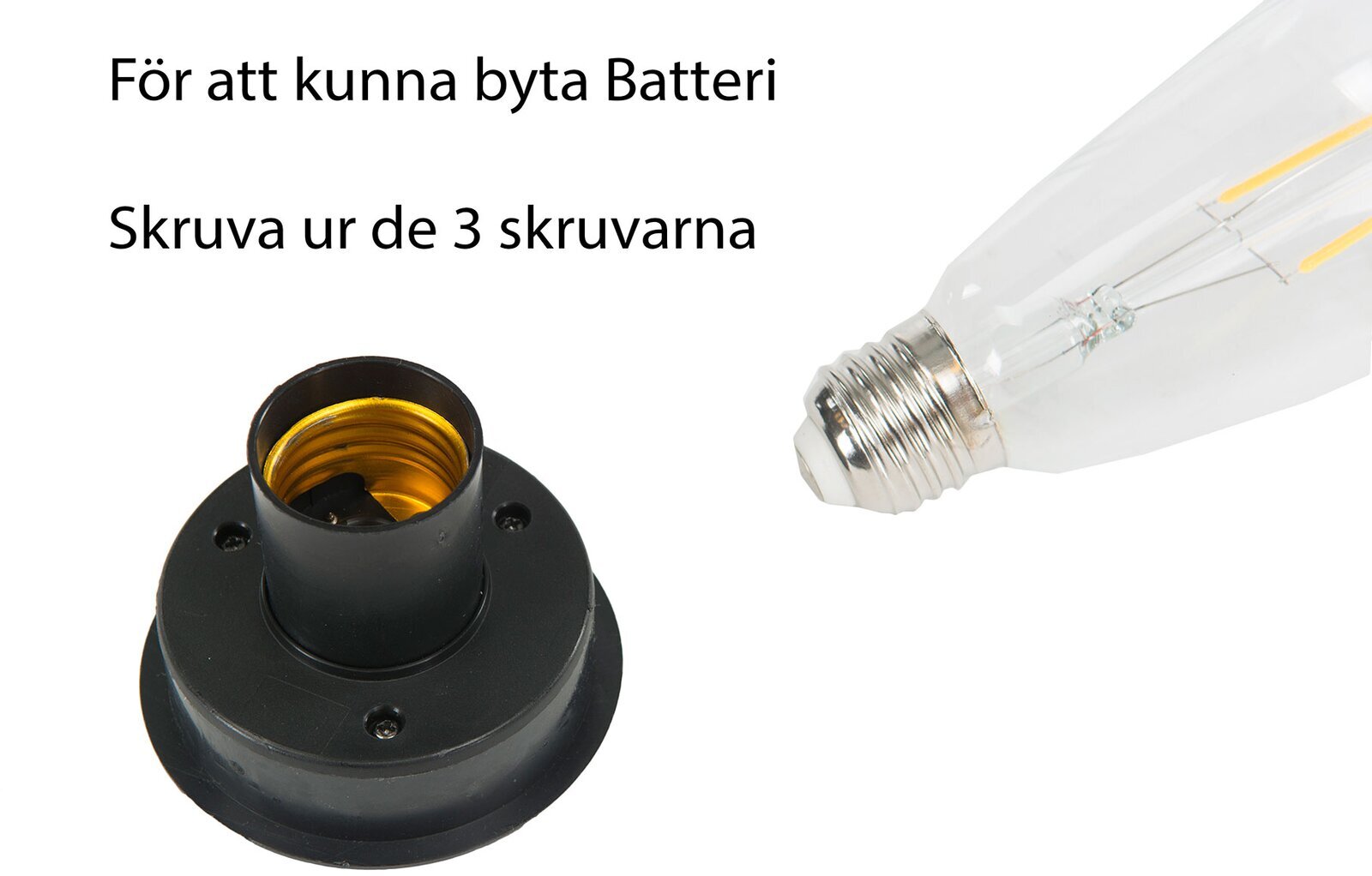 Texten på bilden ger användaren tydliga instruktioner om hur man byter batteriet i lampan. Instruktionerna är enkla och direkta, vilket visar produktens användarvänlighet och gör det enkelt för vem som helst att följa steg-för-steg-processen utan att behöva annan teknisk vägledning.