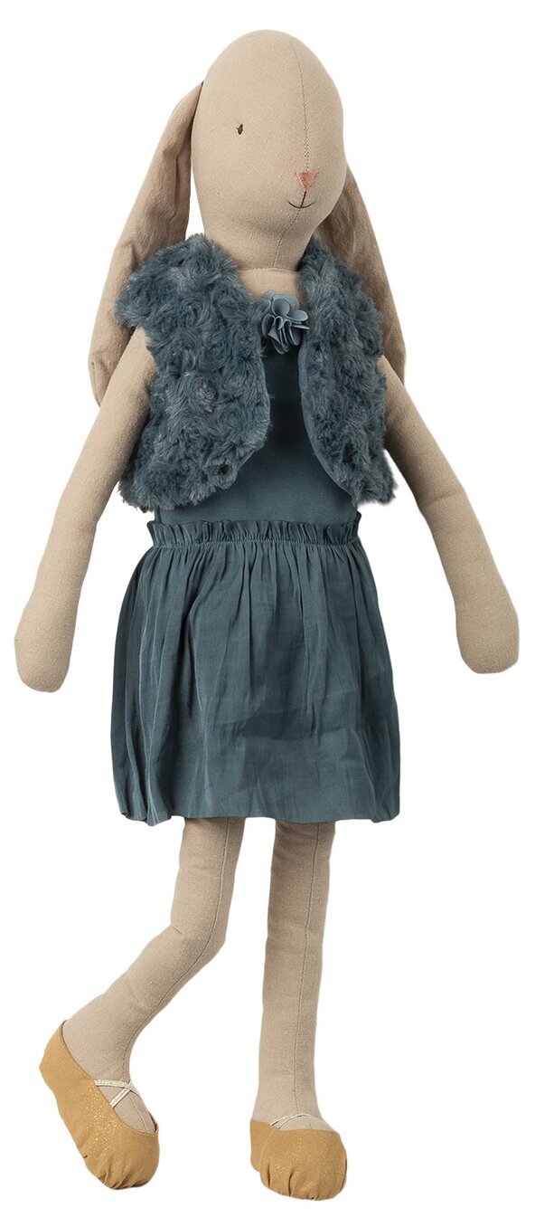 Kaninen har en mjuk konstruktion, klädd i en petrolfärgad klänning som omfamnar kroppen med ett skört och spillväggsliknande tyg. Detta material skapar en vacker fläkt- och veckeffekt, vilket ger liv till plagget. På överkroppen bär Bunny Ballerina en lurvig väst i samma nyans. Västen är dekorerad med en liten, stilfull blomdetalj i kanten som ger en känsla av elegans till hela utseendet.
