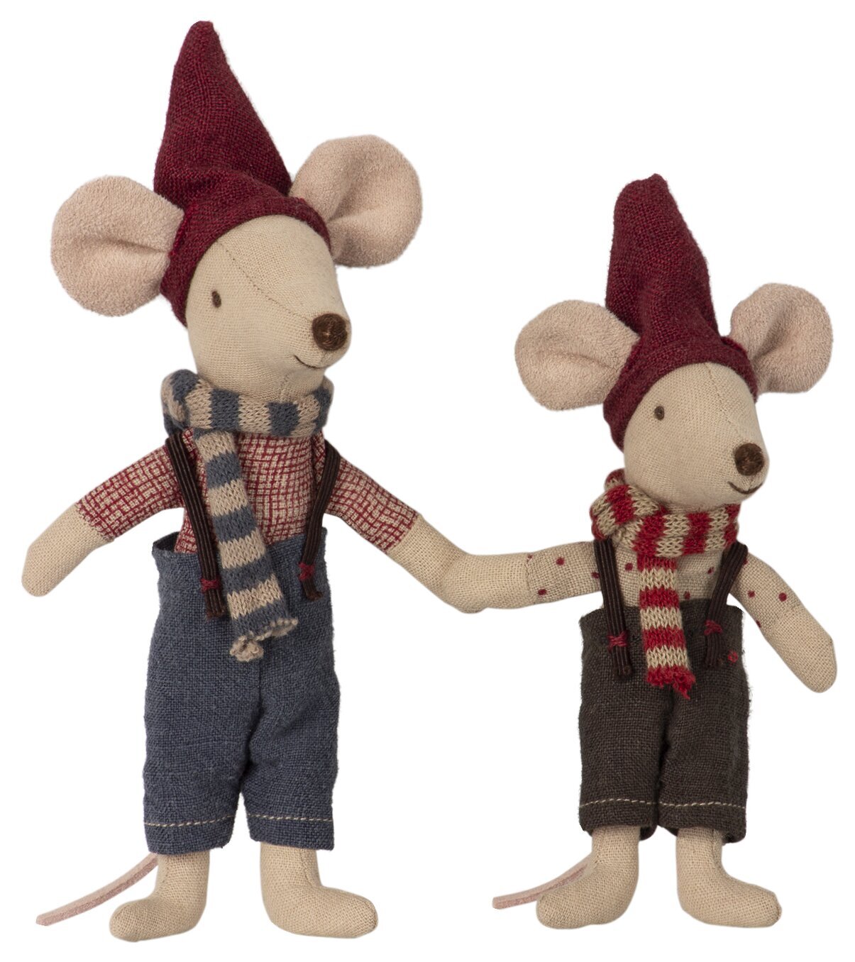 Den större musen till vänster bär en djup röd tomteluva, som står i kontrast till dess ljusa, mjuka ansikte och stora, runda öron. Den har på sig en rutig tröja i röd ton kombinerad med ett par blå hängselbyxor som når till musens fötter. En gemytlig halsduk, i grå och blå ränder, pryder halsen och bidrar till en vinterkänsla som passar perfekt för högtiden.