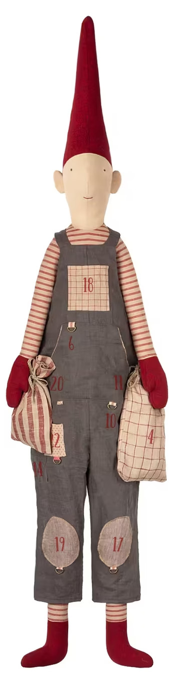 Pixy Boy bär en randig tröja i rött och beige under en grå overall. Overallen är dekorerad med flera fickor, där nummer i röda toner pryder varje ficka, vilket antyder kalenderns syfte att räkna ner till jul. Dessa fickor erbjuder plats för små gåvor eller överraskningar, vilket är perfekt för julkalenderns överraskningsmoment.