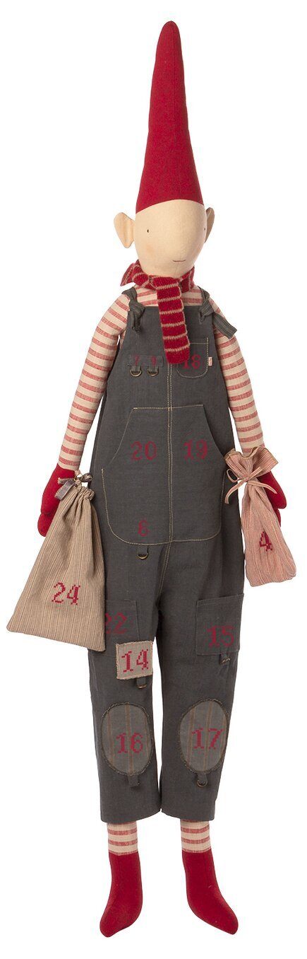 Bilden visar en charmig figur som tillhör den produkt som kallas Kalender Pixy Boy från varumärket Maileg, tillgänglig hos Köpstaden.se. Figuren är klädd i en gråblå overall med stora fickor, varpå flera nummer i rött står tryckta, vilket ger intrycket av en traditionell adventskalender. Denna textildocka bär en lång röd luva på huvudet som sträcker sig rakt upp i en spetsig form, vilket förstärker dess nisseartade utseende och ger en festlig atmosfär.