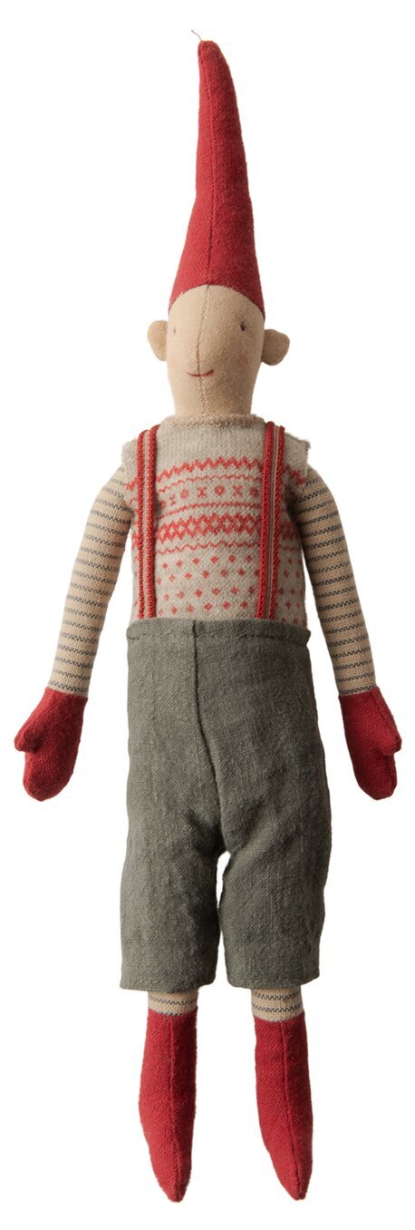 Denna bild visar en charmig Tomtenisse Mini Pixy från varumärket Maileg, som finns tillgänglig på Köpstaden.se. Nissen har en klassisk design som fångar essensen av traditionell nordisk jul. Hans mössa är lång och spetsig, prydd med en djup röd färg som står i härlig kontrast mot de övriga lugnare tonerna.