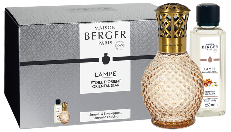 I närheten av lampan visas även en flaska doftolja, markerad med en klar etikett, som harmoniskt kompletterar setet. Flaskans innehåll uppgår till 250 ml, och etiketten betonar doften "Étoile d'Orient Oriental Star". Denna doft blandar orientaliska toner och beskrivs som både sensuell och lockande. Flaskans rena design och transparens bidrar till ett enhetligt visuellt intryck med lampans vintage estetik.