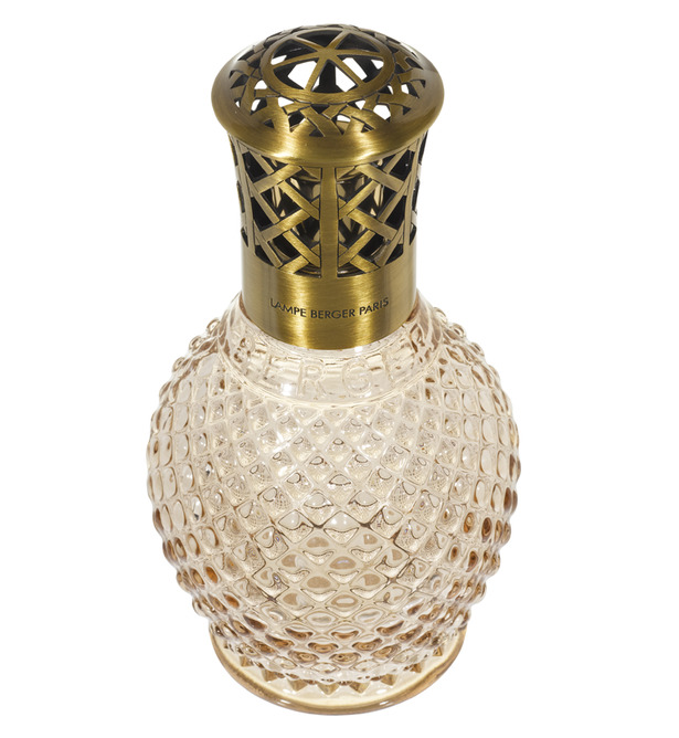 Bilden visar en doftlampa från Maison Berger Paris, specifikt modellen kallad Originelle Nude Vintage Giftset, som finns tillgänglig hos Köpstaden.se. Doftlampans design är en fusion av klassisk estetik och elegant formgivning. Lampans kropp har en klotform och är tillverkad i robust glas, vilket ger den en solid men ändå sofistikerad utstrålning. Glasytans struktur är prydd med ett detaljerat geometriskt mönster som skapar en känsla av djup och textur.