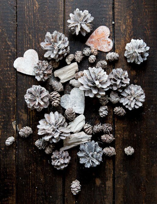 Bland kottarna smälter platta dekorationer i form av hjärtan och stjärnor in, var och en noggrant placerad för att skapa balans i arrangemanget. Dessa dekorationer, också från produktserien Dekormaterial Stjärna/Hjärta, har en subtil skiftning i toner från vit till en dämpad rosaliknande färg, vilket bidrar till bildens mjuka och harmoniska tema. De hjärtformade dekorationerna kontrasterar delikat mot de naturligt robusta kottarna, vilket ger en fin balans mellan det naturliga och det handgjorda.