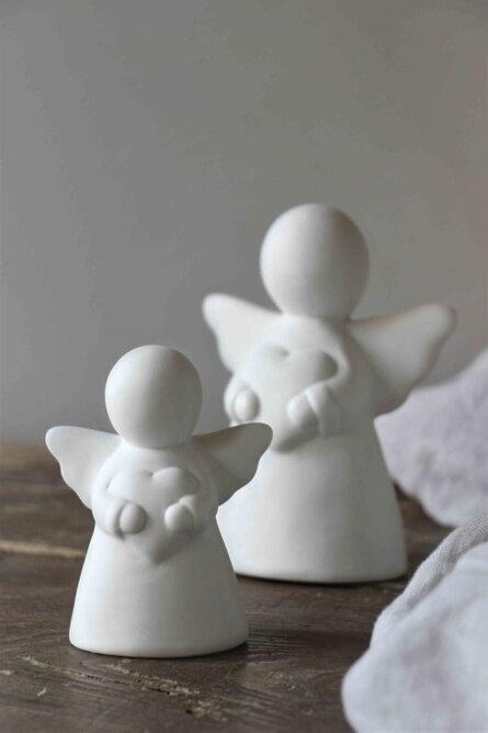 Figurerna är tillverkade i ett enkelt och stilrent material som ser ut att vara keramik eller porslin. De är helt vita och har en matt yta som ger dem ett mjukt och tidlöst uttryck. Den största ängeln står i bakgrunden. Den håller en form, eventuellt ett hjärta, i båda händerna och har utsträckta vingar. Det subtila formspråket påminner om traditionellt hantverk där fokus ligger på enkla linjer och rena former. Den mindre ängeln står i förgrunden och följer samma design, vilket skapar en harmonisk helhet.