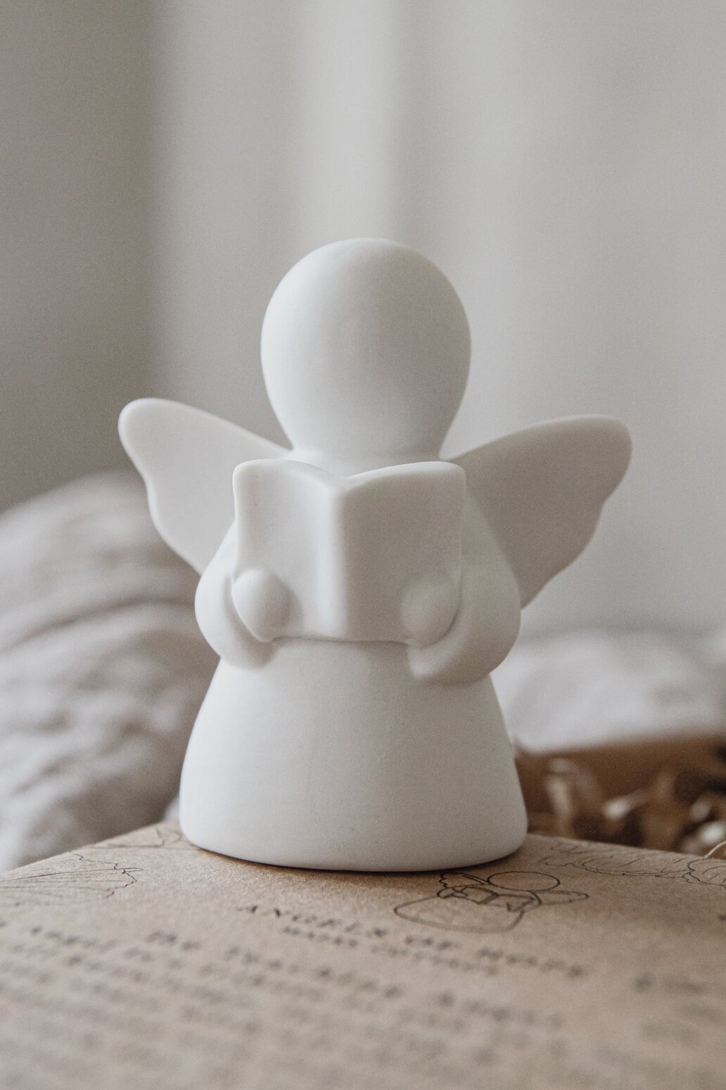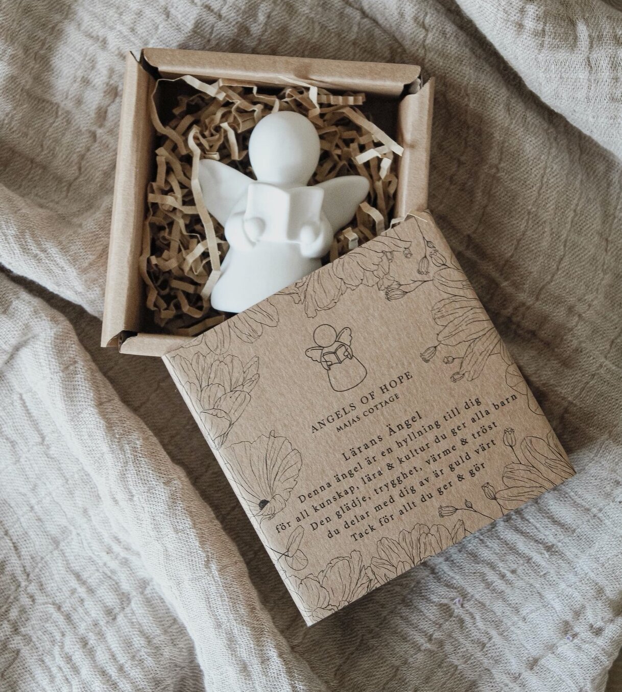 Vacker ängel, Lärans ängel, i vit keramik. Levereras i en fin gåvobox. Från Majas Cottage.