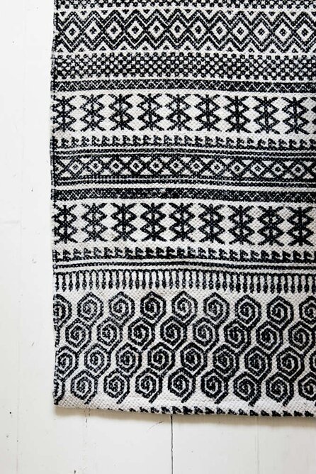 Bilden föreställer en matta med namnet Aztec Lines från Majas Cottage, tillgänglig hos Köpstaden.se. Mattan har ett fängslande geometriskt mönster som domineras av svartvita linjer och former. De regelbundna mönstren väcker associationer till traditionella aztekiska motiv, vilket kan tilltala dem som uppskattar både modern och kulturell inredningsstil.