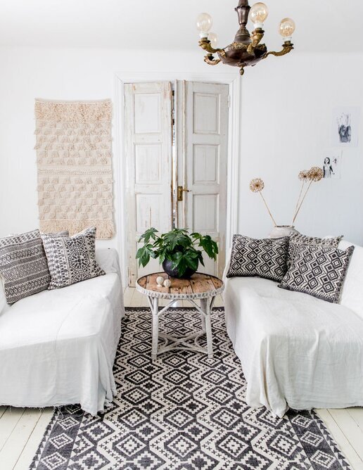 Bilden visar ett inbjudande och stilfullt inrett rum, perfekt för avkoppling och samtal. Centralt i rummet finns en matta från Majas Cottage, benämnd Matta Aztec Tribes, känd för sitt geometriska mönster i svartvitt. Detta mönster kompletterar de övriga färgerna i rummet på ett smakfullt sätt. Mattan sträcker sig över golvet mellan två soffor, båda täckta med vita överdrag som ger en ren och luftig känsla.
