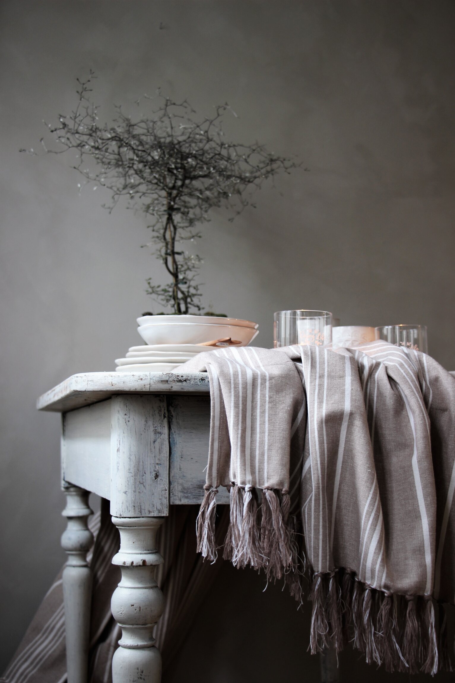 I bilden från Köpstaden.se ser vi en vackert arrangerad dukning där produkten Duk Stripes från varumärket Majas Cottage står i centrum. Denna duk är draperad över kanten på ett rustikt bord, som har en blek, vitmålad yta med synliga spår av väderbitna år. Bordet vilar stabilt på snirkligt svarvade ben som ger en känsla av tidlöshet och historia.
