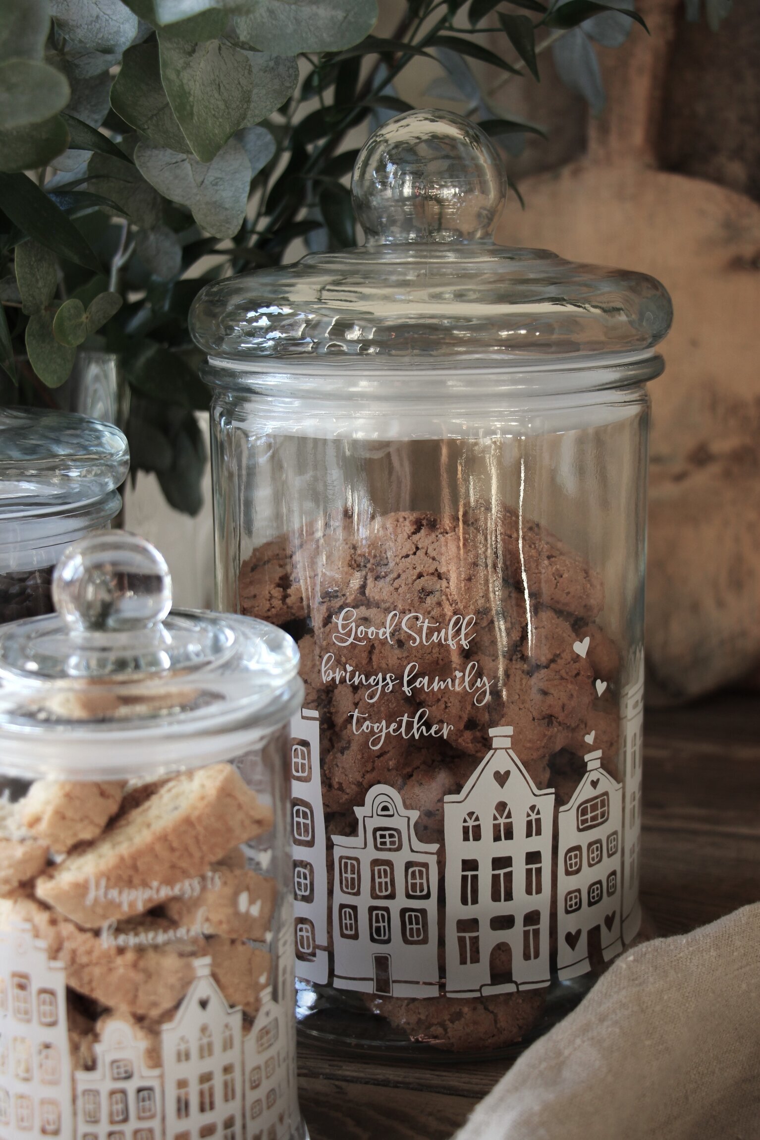 På bilden från Köpstaden.se ser vi en charmig uppsättning glasburkar från Majas Cottage. Dessa glasburkar utmärker sig med sina eleganta men funktionella design. Burken i förgrunden drar uppmärksamhet med sin höga, cylindriska form och en transparent yta som avtäcker innehållet, vilket i detta fall består av vad som ser ut att vara hembakade chokladkakor. Den tydliga texten på sidan av burken lyder "Good Stuff Brings Family Together", vilket ger en härlig, familjär känsla.