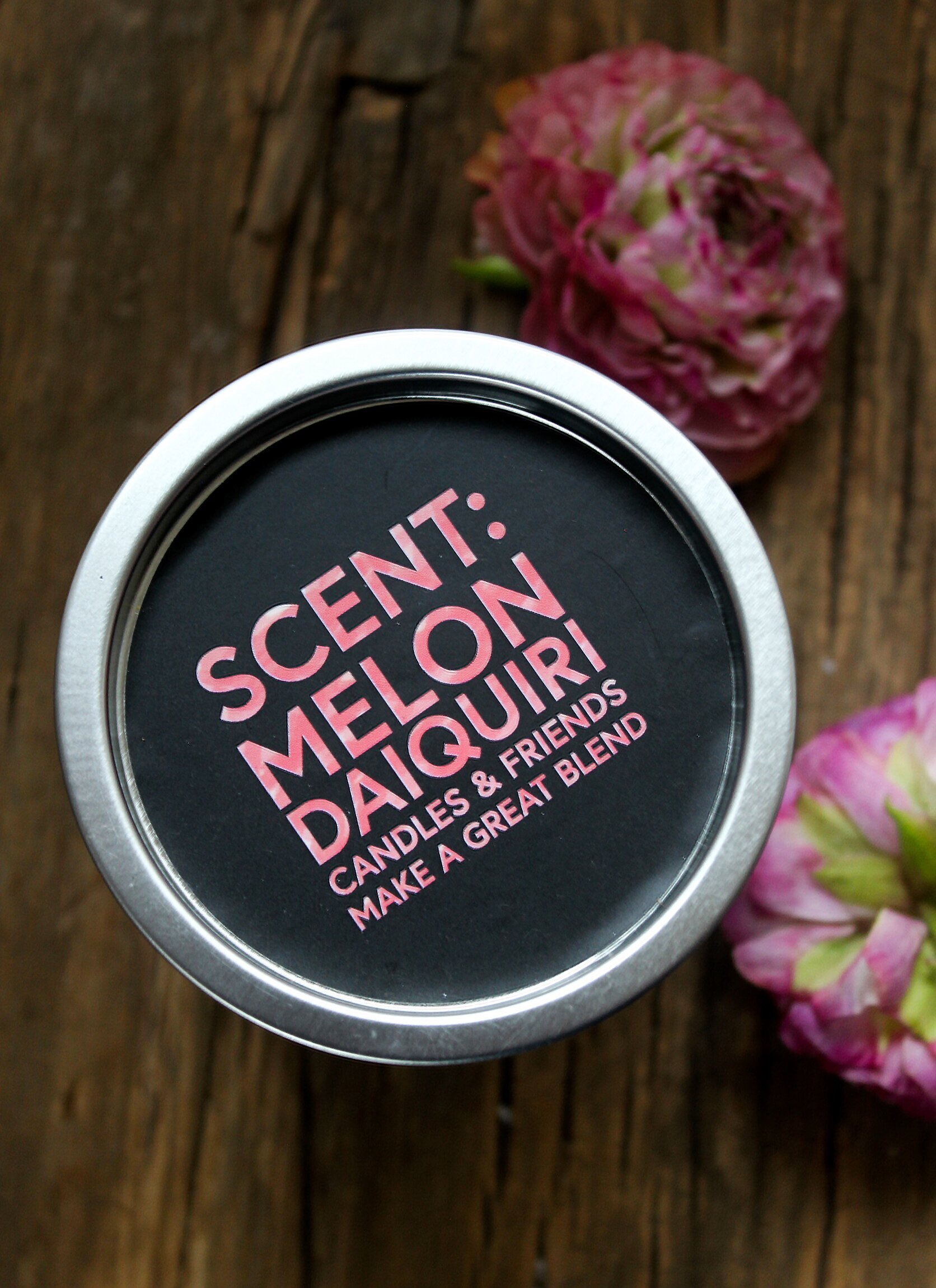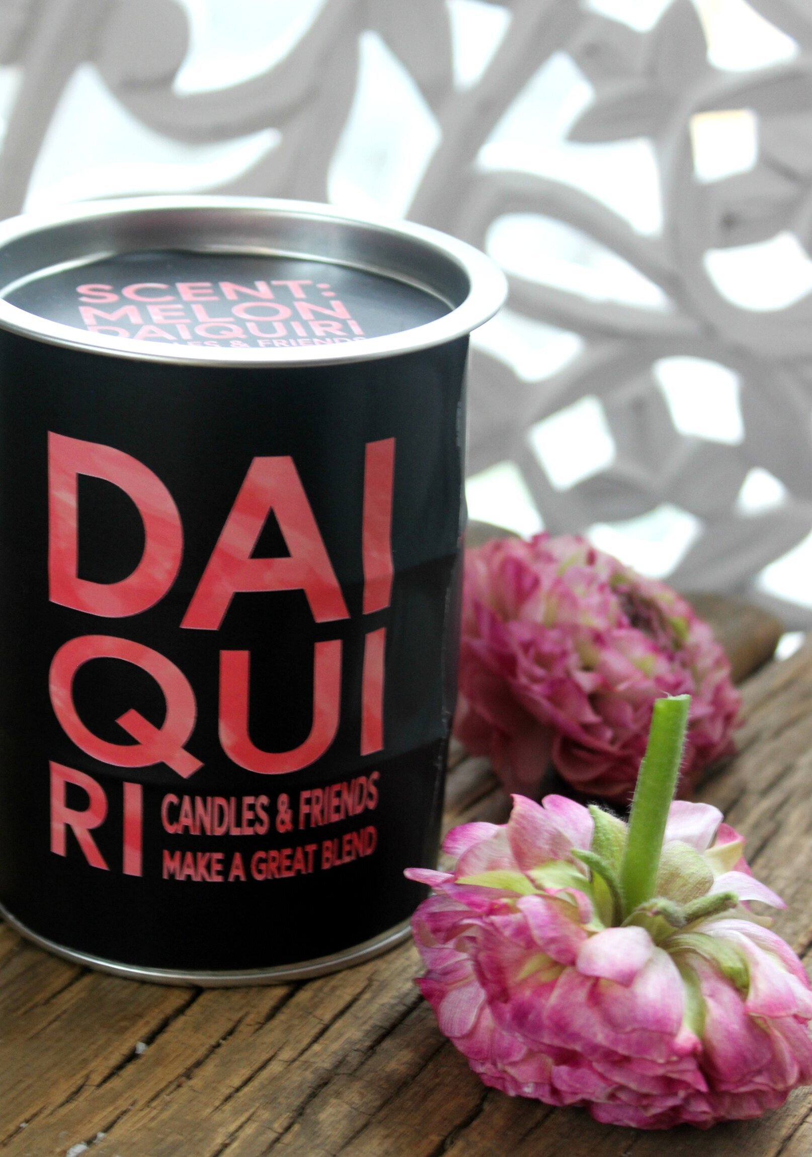 Doftljus från Majas Cottage med en härlig doft av somrig melon, Daiquiri. Glaset har en svart finish med röd text som lyder: Daiquiri, candles and friends makes a great blend.