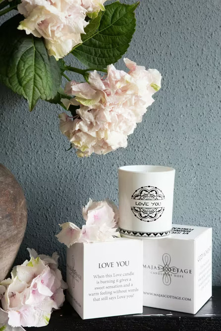 Text på förpackning: When this Love candle is burning it gives a sweet sensation and a warm feeling without words that still says I Love you.