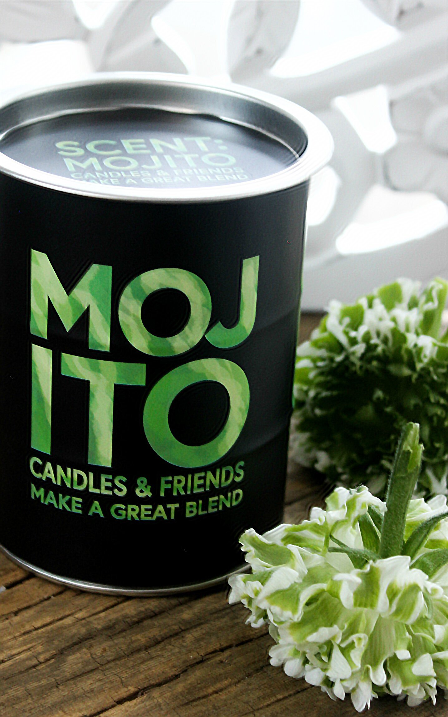 Doftljus från Majas Cottage med en härlig doft av somrig Mojito. Glaset har en svart finish med grön text som lyder: Mojito, candles and friends makes a great blend.