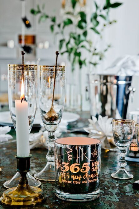 På bilden från Köpstaden.se, som erbjuder ett brett sortiment av produkter för vardagens alla behov, ser vi en smakfull uppsättning på ett vackert dukat bord. Centralt i bilden är en glaslykta från produktlinjen 365 Days från Majas Cottage. Lyktan är dekorerad med inspirerande text och motiv, vilket för tankarna till förnyelse och möjligheter, med orden “365 new days, 365 new chances” ingraverade tillsammans med små stjärnor och fyrverkerimotiv.
